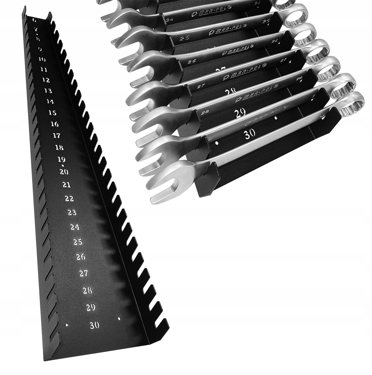 Настенная вешалка для набора рожковых ключей. Вешалка изготовлена из стального листа толщиной 2 мм с порошковым покрытием. В вешалке имеется 25 ячеек для ключей.