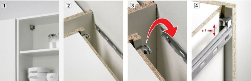 - Вешалка позволяет регулировать высоту подвеса и расстояние верхнего края шкафа от стены в диапазон 0-13 мм.