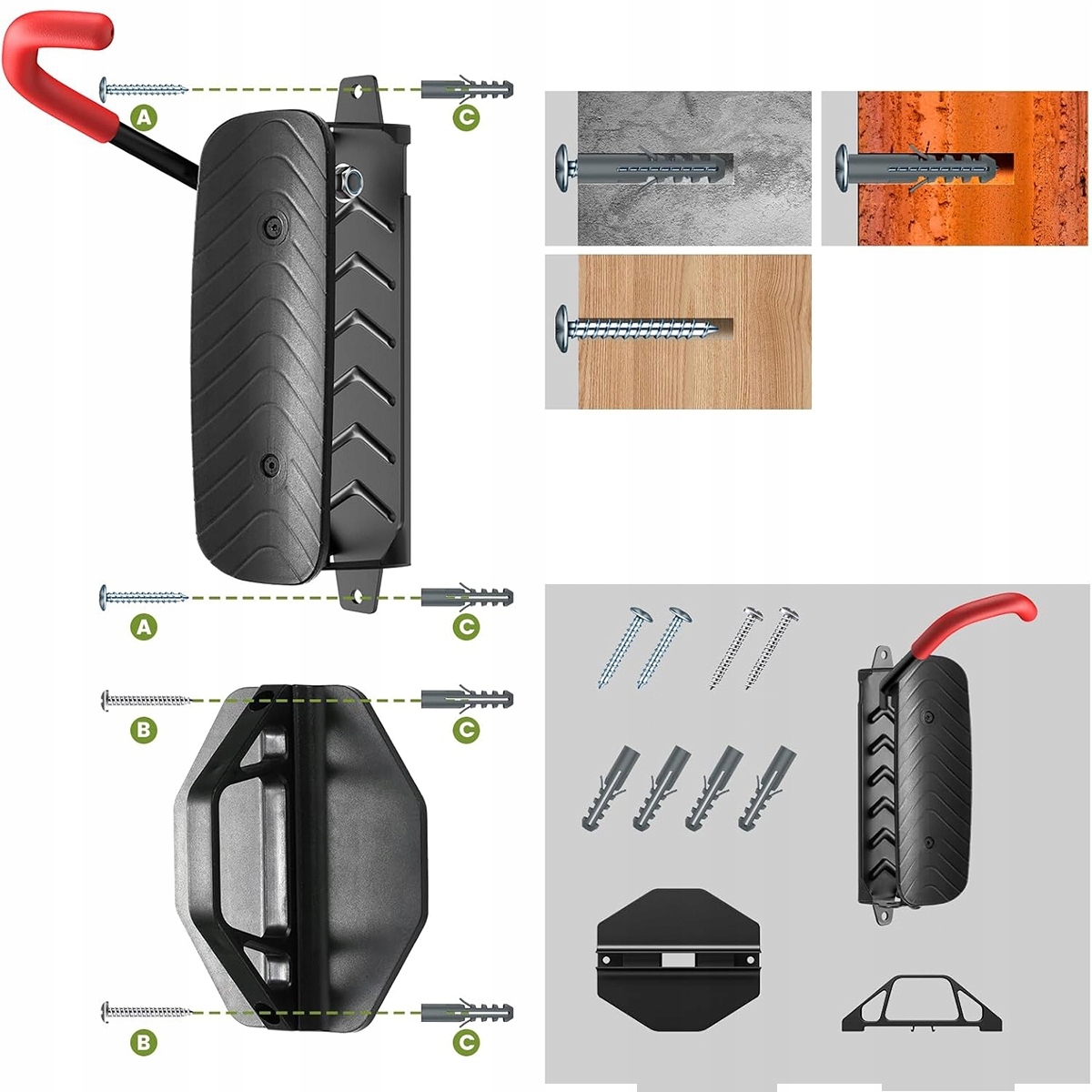 【Сэкономить пространство - ручка вращения с углом 150 °. Он обеспечивает удобное решение для хранения велосипедов вокруг автомобиля и в квартире. Роторная система также позволяет хранить велосипеды вблизи стены. Просто повесите переднее колесо, поместите заднее колесо на стабилизатор и установите стенку под нужным углом. Ручки с вращающимися велосипедами оснащены монтажными винтами для бетонных, кирпичных или скелетных стен. Советы: Держатель велосипеда должен быть установлен только на твердых колоннах, балках, кирпичных или бетонных стенах. Не установите кантилеровную стену (например, стена из штукатурки), если за ней нет сплошной деревянной стойки. Это вдумчивое добавление дает вам уверенность в том, что ваш велосипед и ваш дом останутся верными оригиналу