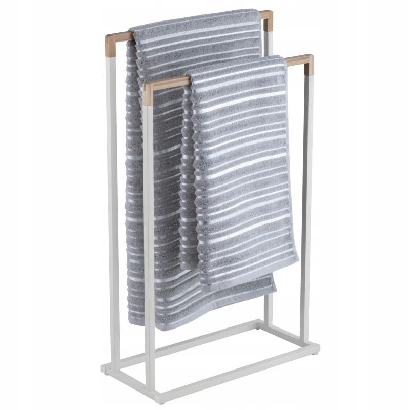 Отдельностоящая двухрычажная вешалка для банных полотенец. Изготовлен из стали, покрыт белой матовой краской. Верхняя часть изготовлена из натурального бамбука, устойчивого к влаге.