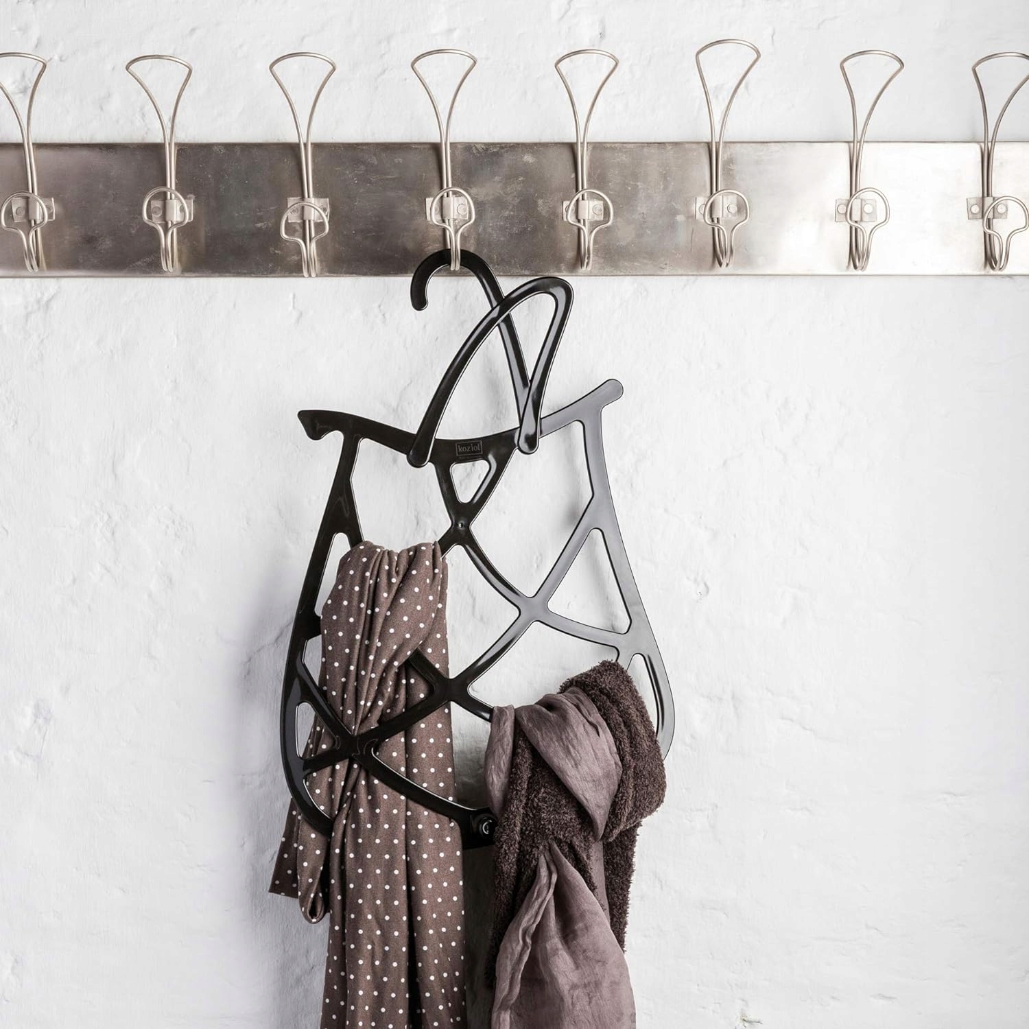 СЕРЫЙ Пластиковая вешалка для шарфов KOZIOL обеспечит каждому шарфу свое, легкодоступное место. Его форма напоминает асимметричную сеть. Через отверстия можно повесить платок, платок, шапку или шаль. Благодаря этому мы будем поддерживать порядок в зале и дополнительно украсим его оригинальным гаджетом.
