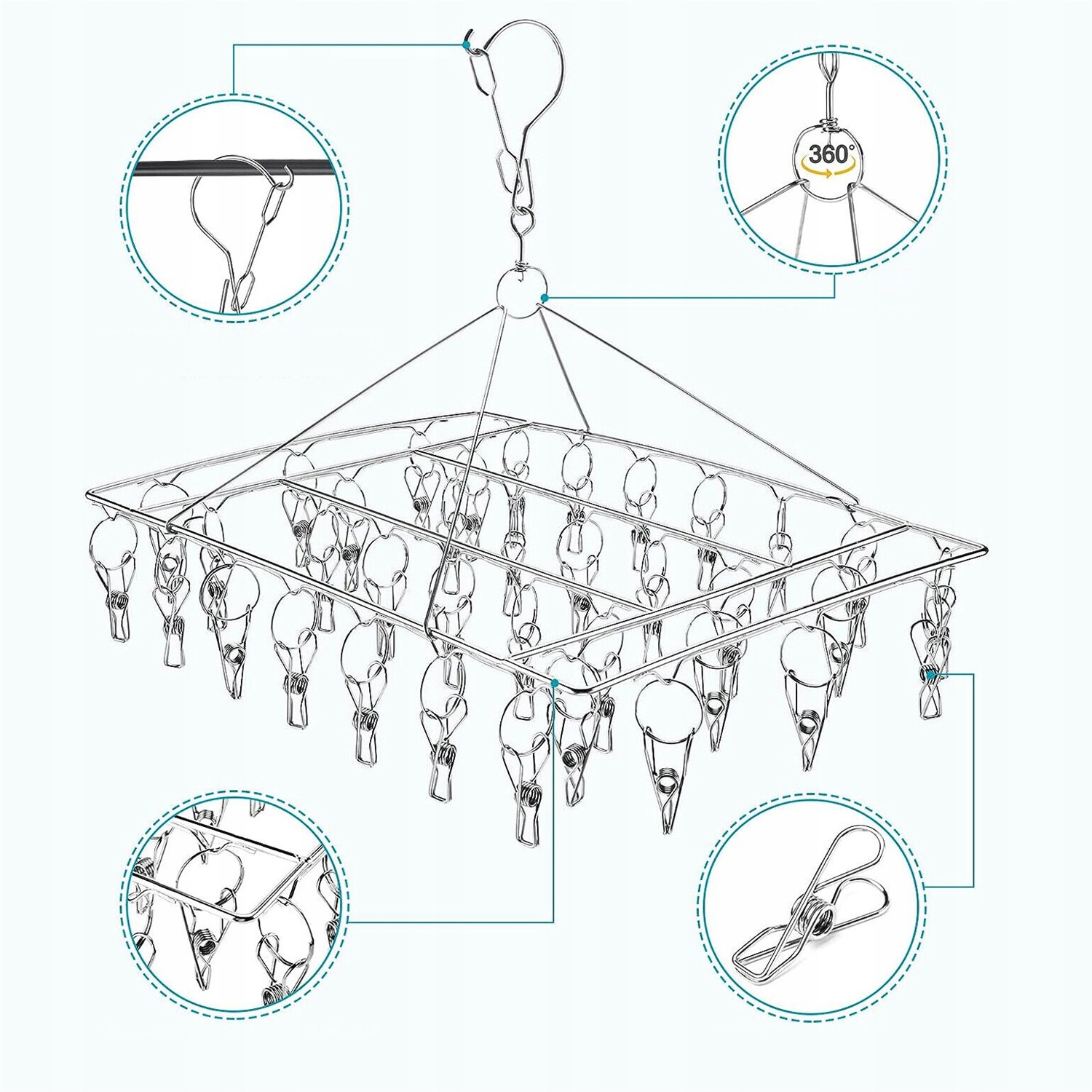 ✅ Блокировка против потери и вращения. - Имеет продуманную ветрозащитную застежку на верхней части крючка и прочный зажим, который полностью предотвращает падение одежды на пол при сильном ветре. Свободное вращение на 360 градусов позволяет быстро сушить одежду за раз, не скользя.