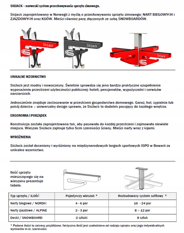 Инновационная вешалка для лыж SKIJACK — это революция в хранилище зимнего снаряжения! Забудьте о беспорядке и нехватке места для ваших лыж! Skijack основывает свою функциональность на норвежском патенте, обеспечивая идеальное хранение вашего оборудования с минимальным занимающим пространством. Предыдущая версия крепления была улучшена и стала максимально универсальной и подходит для всех типов лыж.