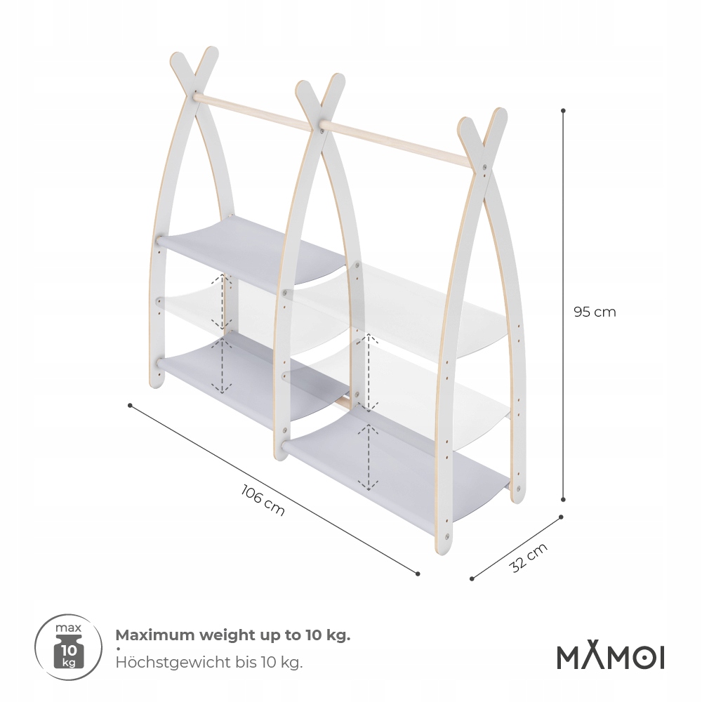 Вешалка для одежды Mamoiизготовлена безопасным для детей и окружающей среды способом, с использованием качественных, сертифицированных препаратов. Изделие выдерживает нагрузку до 10 кг. Точная подгонка каждого элемента, гладкие края и деликатный материал предотвращают травмы и обеспечивают безопасность. В комплект входят боковины конструкции, стойки, светло-серый материал и металлические элементы крепления. Светло-серый оттенок гарантирует стильный и вневременной вид. Простая форма гарантирует вневременность и универсальность.