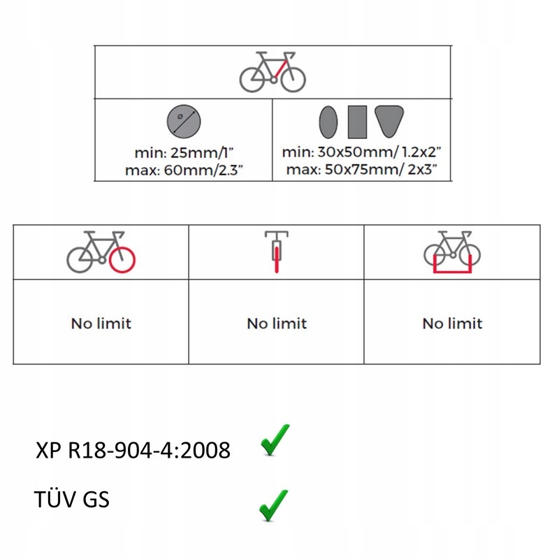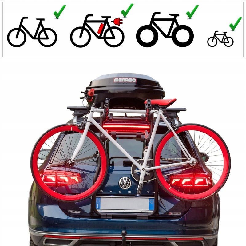 Для транспортировки всех видов велосипедов (мужские, женские, детские, гора, электрический, жирный велосипед) с диаметром 30 - 70 мм рамы и высоты шин с 22 ' - 29 дюймов.