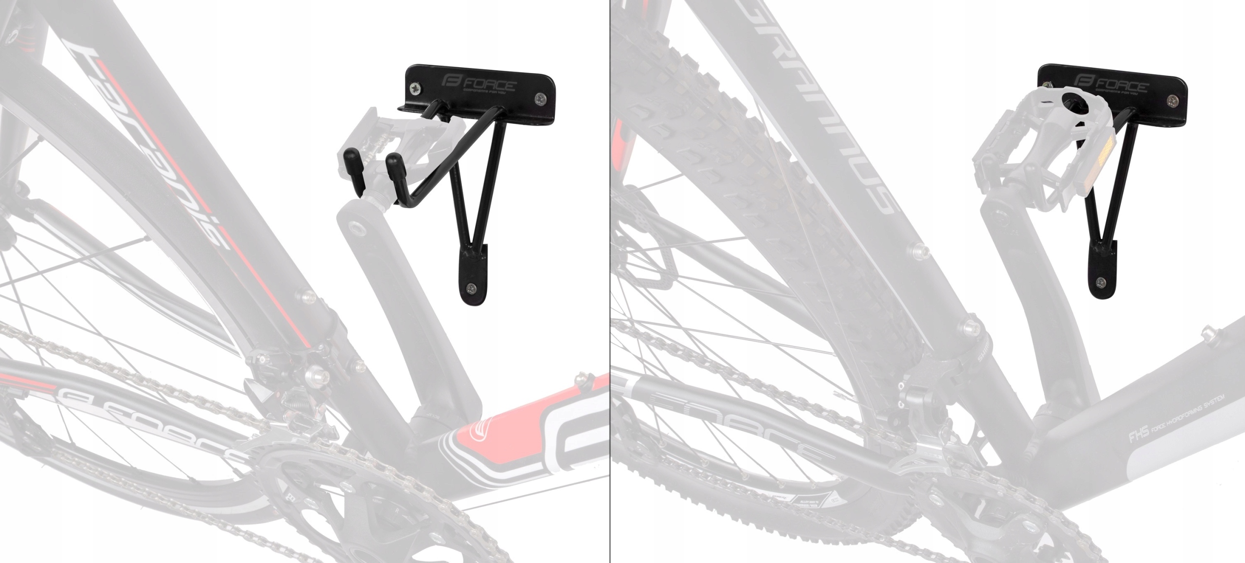 Практическая настенная вешалка бренда FORCE, облегчающая подвешивание велосипеда за педаль на стене в гараже или подвале.