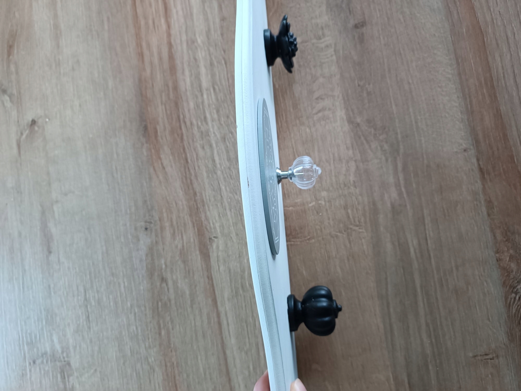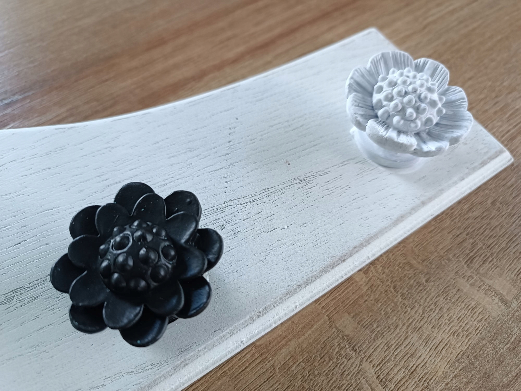 Вешалка настенная белая, слегка серая, с ручками в форме цветов - цветы черные, белые и прозрачные.