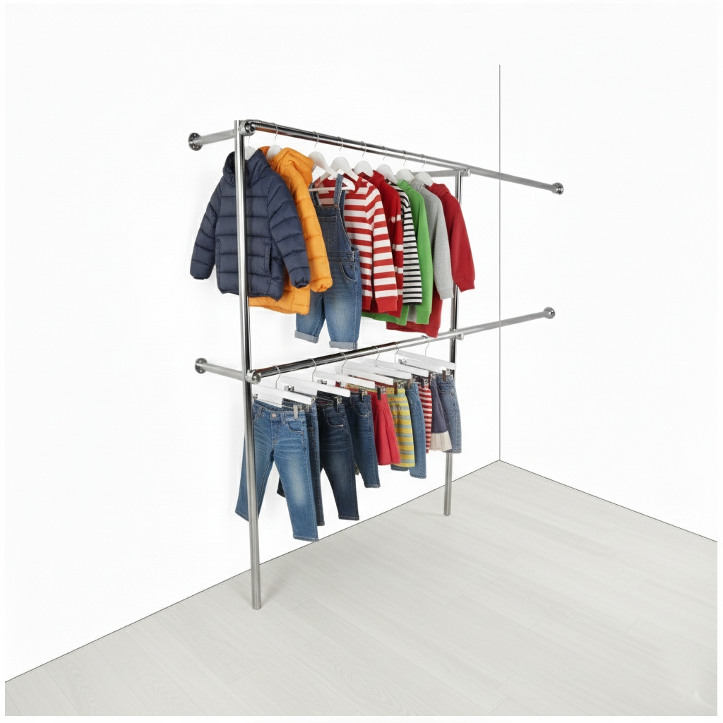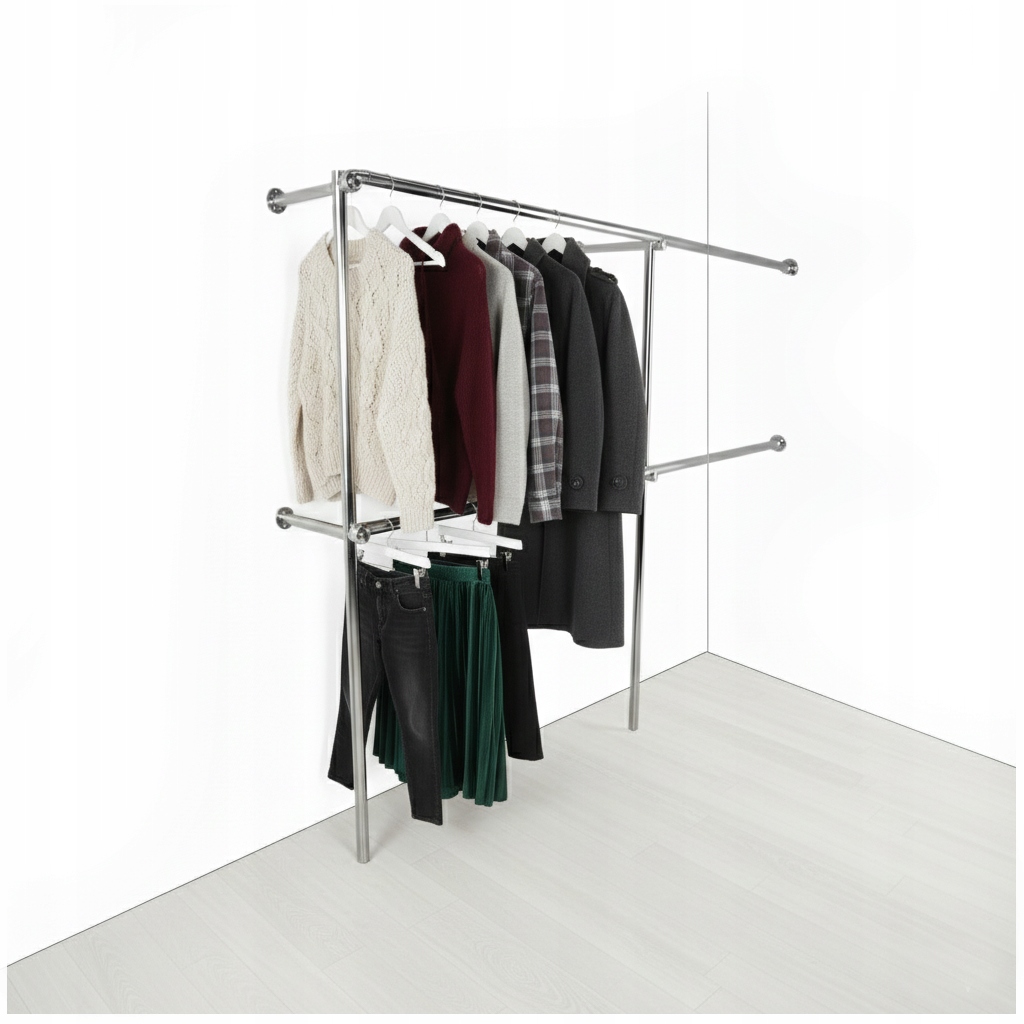 ❇️Вам нужно надежное и функциональное решение для хранения одежды в магазине или гардеробной? Наша настенная угловая полка длиной 3 метра — идеальный выбор! Изготовленный из высококачественных итальянских труб толщиной 1 мм и отделанный прочным хромом, он гарантирует не только долговечность, но и изящный внешний вид на долгие годы. Возможность крепления к левой или правой стене делает его чрезвычайно универсальным. Вы получаете до 6 погонных метров места для развешивания одежды, а регулируемая высота уровней позволяет подогнать ее под свои нужды. В комплект входят все необходимые элементы для сборки и инструкция по сборке!
