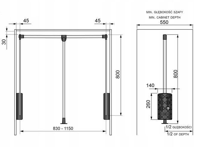 Пантограф с регулируемой шириной стержня от 830 мм до 1150 мм.