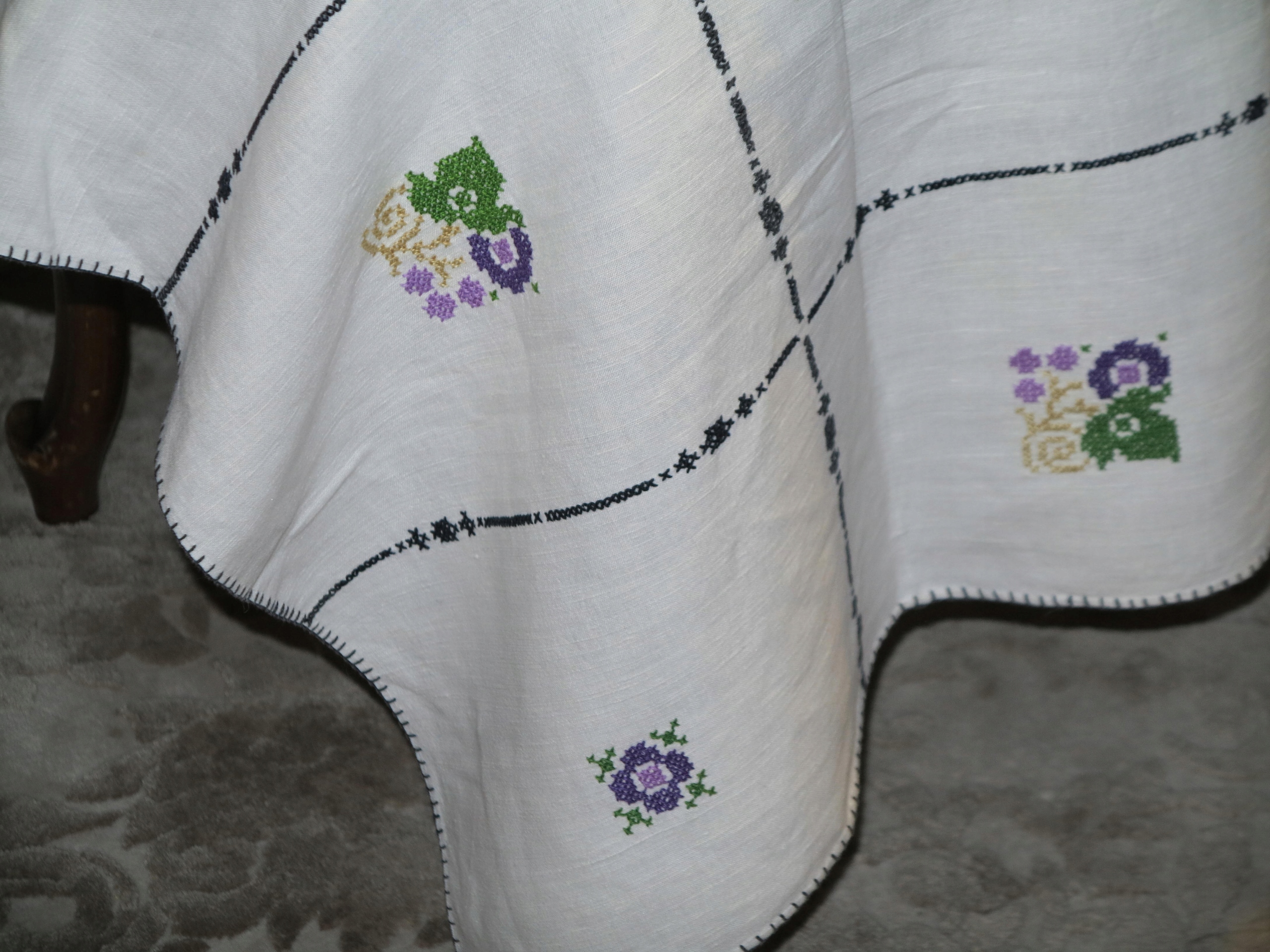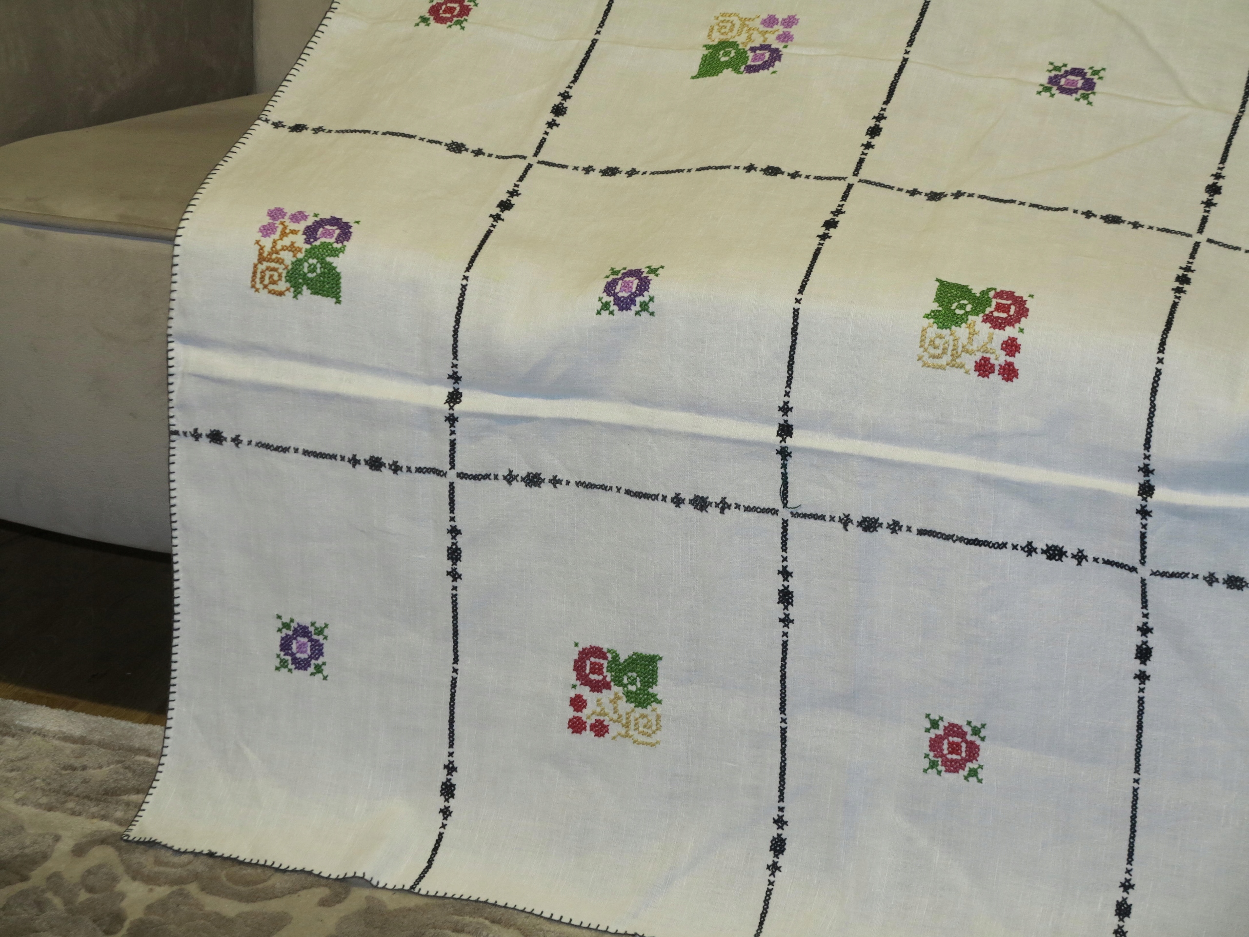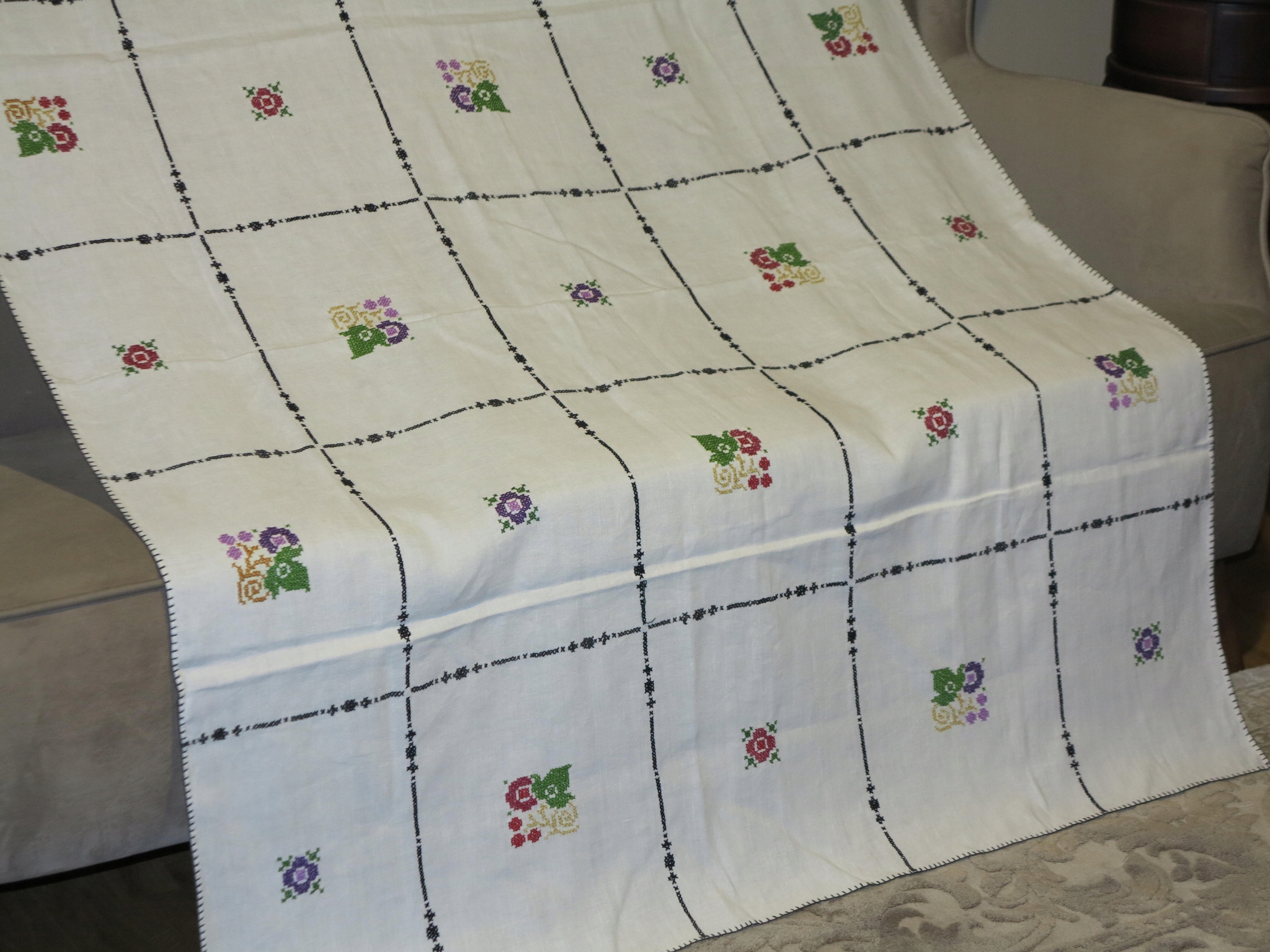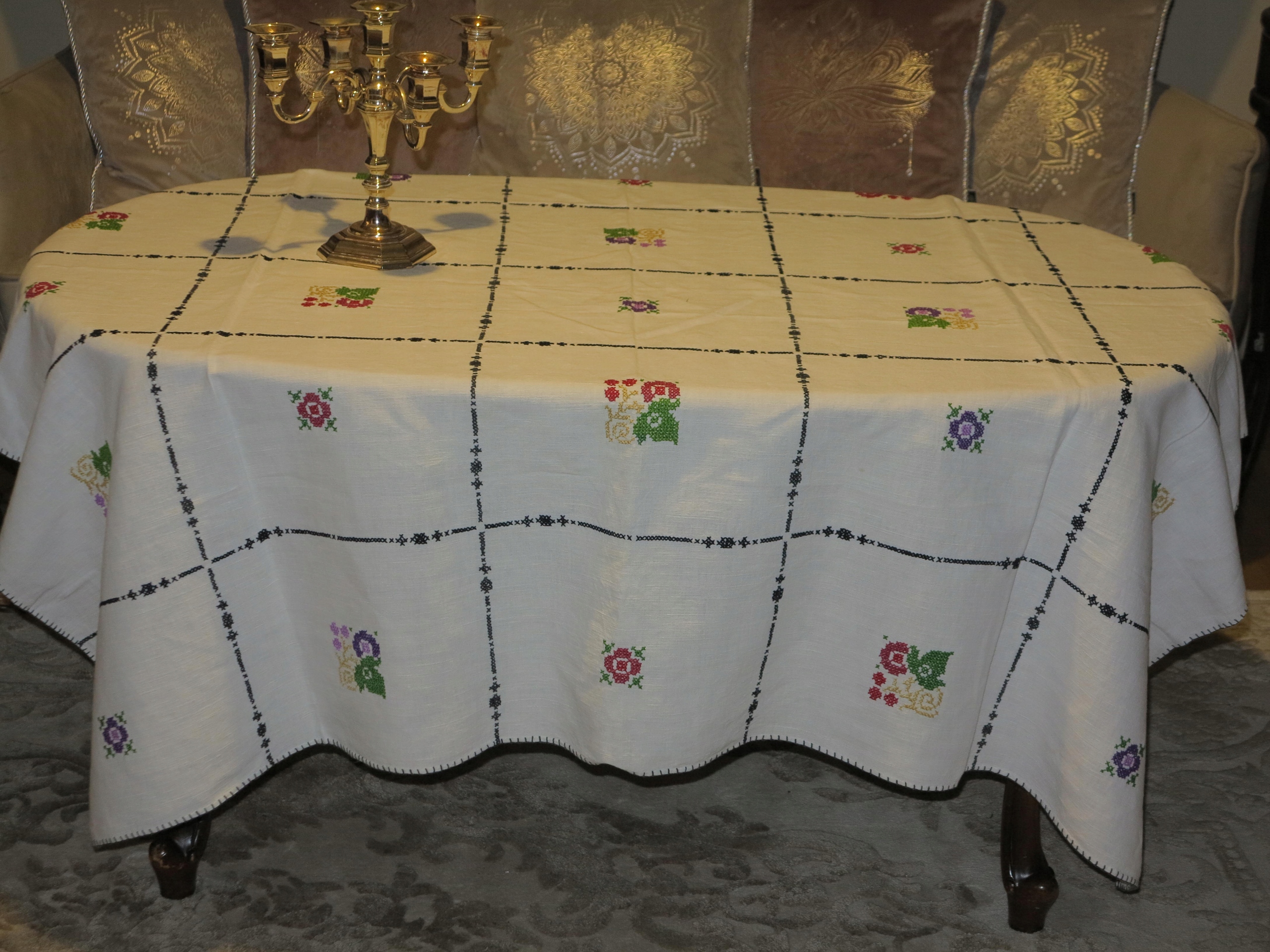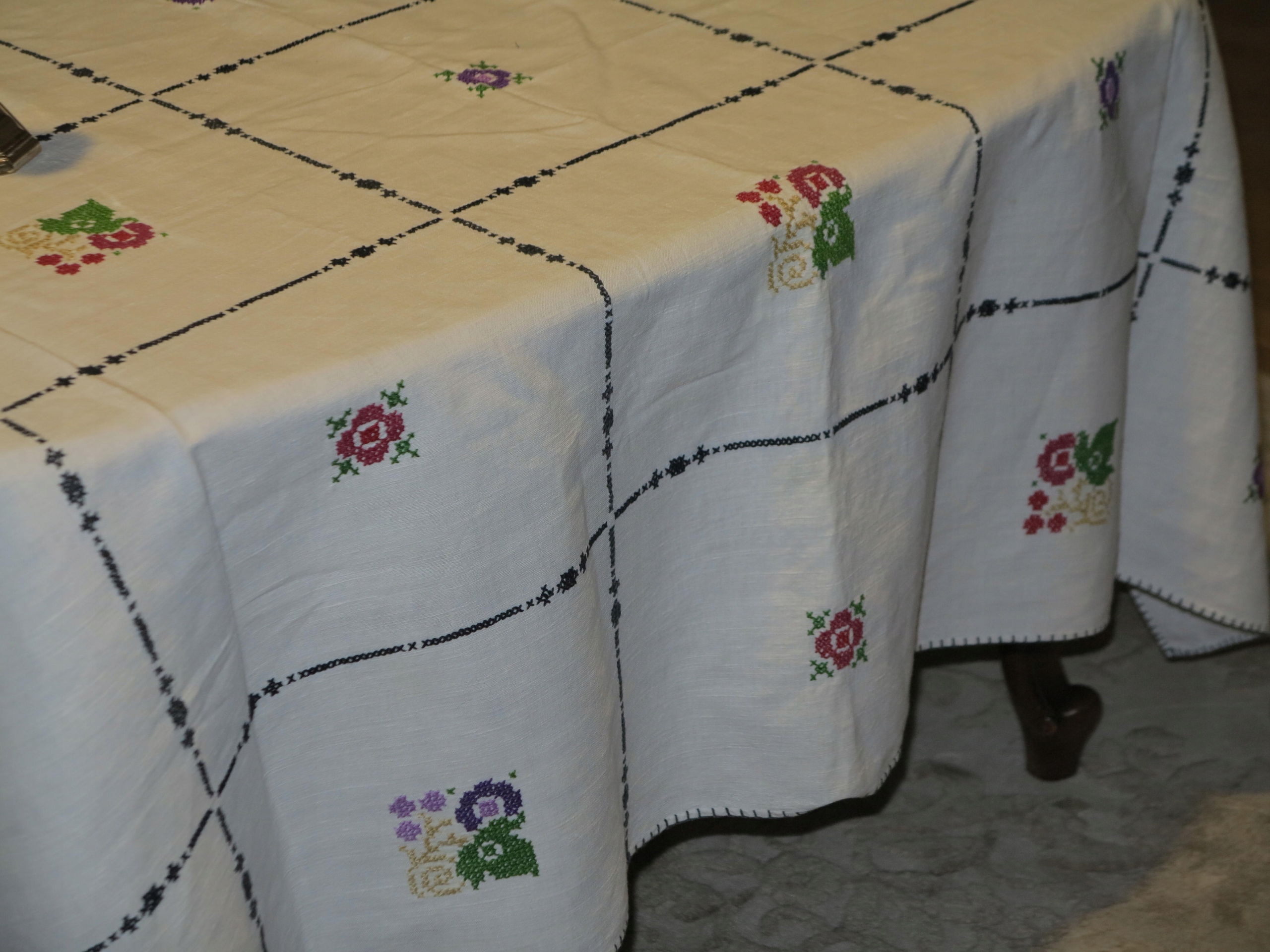 КРАСИВУЮ СТАРУЮ ЛЬЯНУЮ СКАТЕРТЬ С ИНТЕНСИВНОЙ РУЧНОЙ ВЫШИВКОЙ КРЕСТОМ, ТРЕБУЮЩЕЙ МНОГО ВРЕМЕНИ РУЧНОЙ РАБОТЫ.