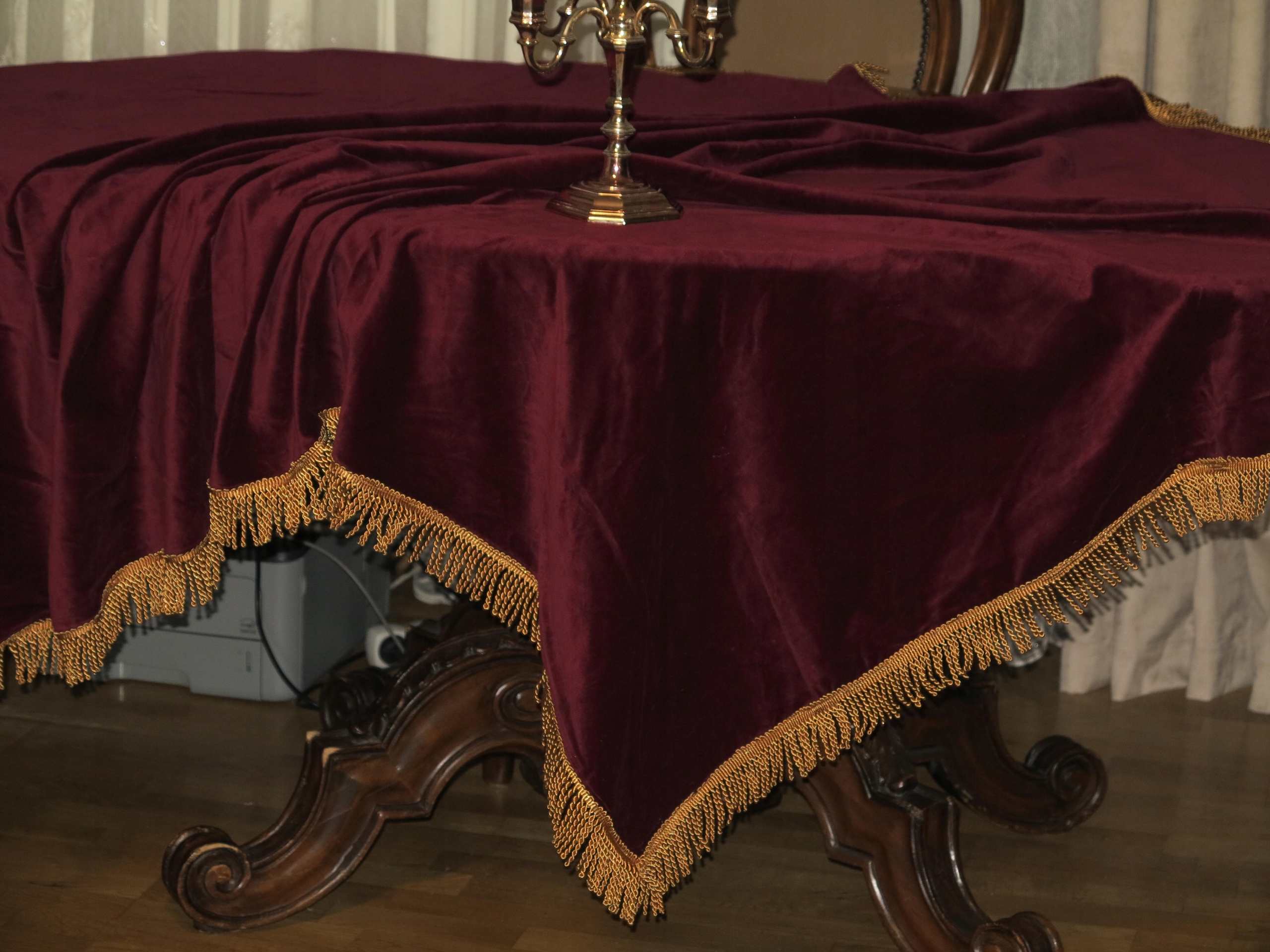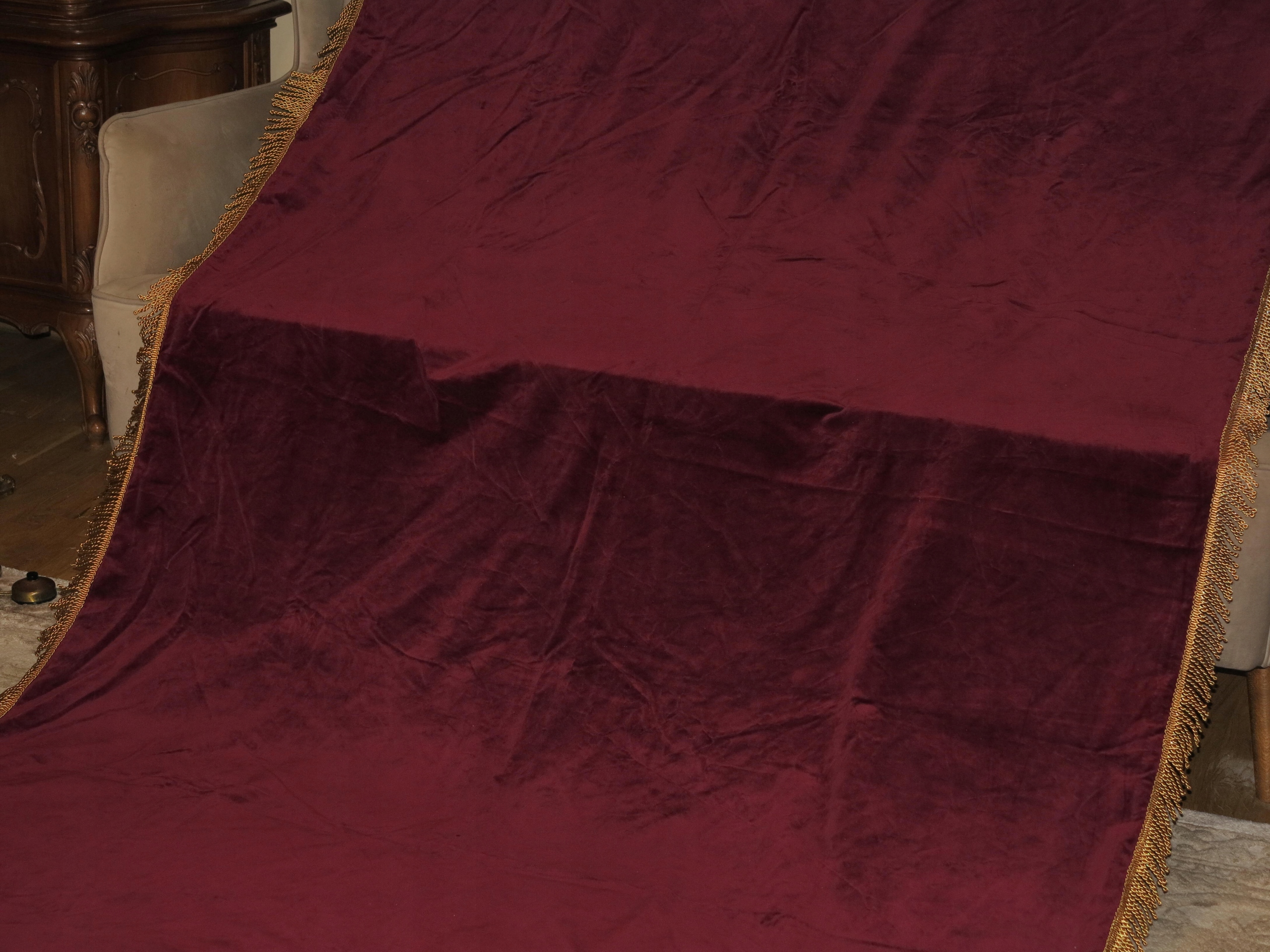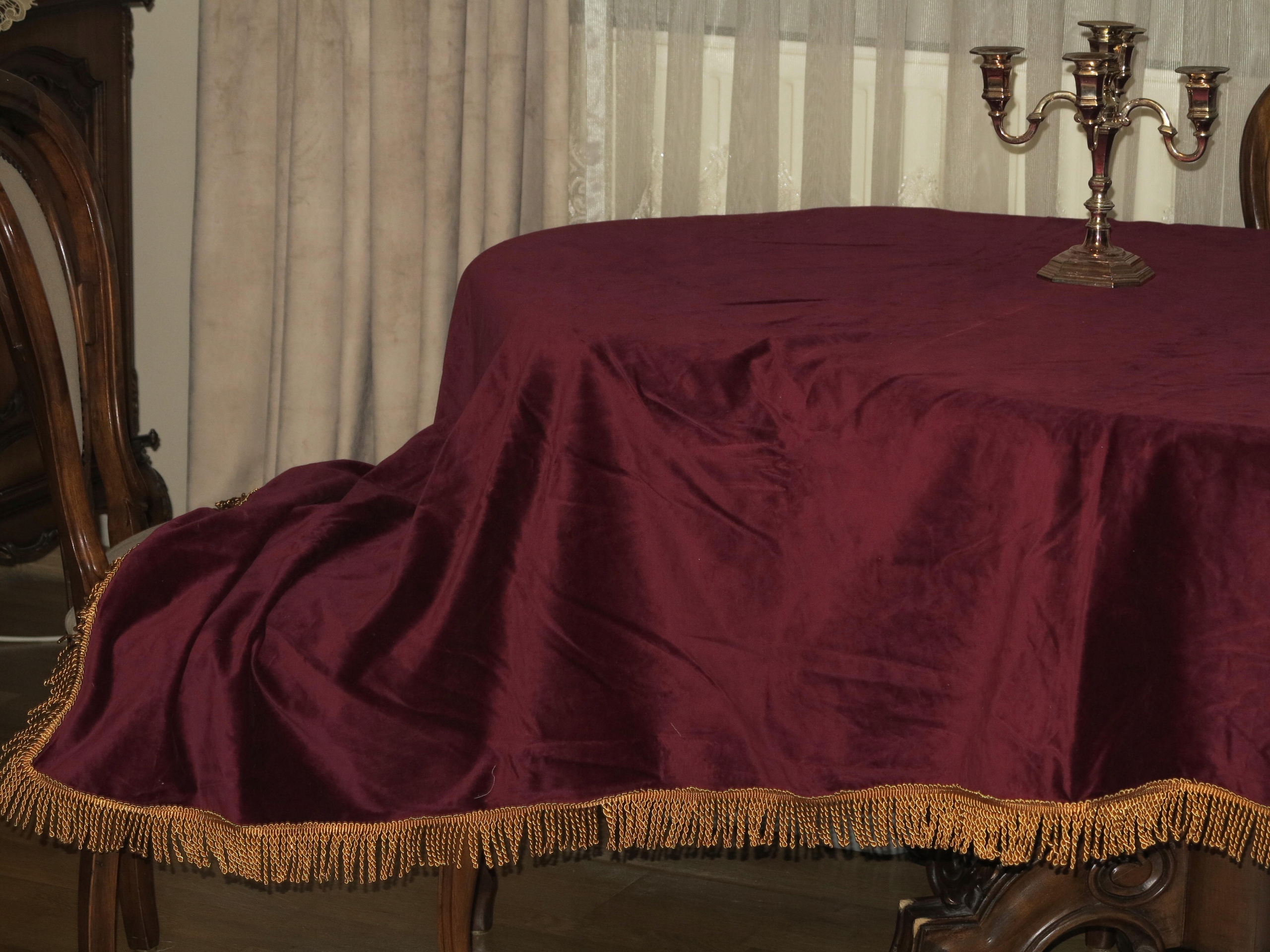 ИЗЫСКАННАЯ СКАТЕРТЬ ИЗ ХЛОПКОВОГО БАРХАТА бордового цвета с густой бахромой 251/144+5