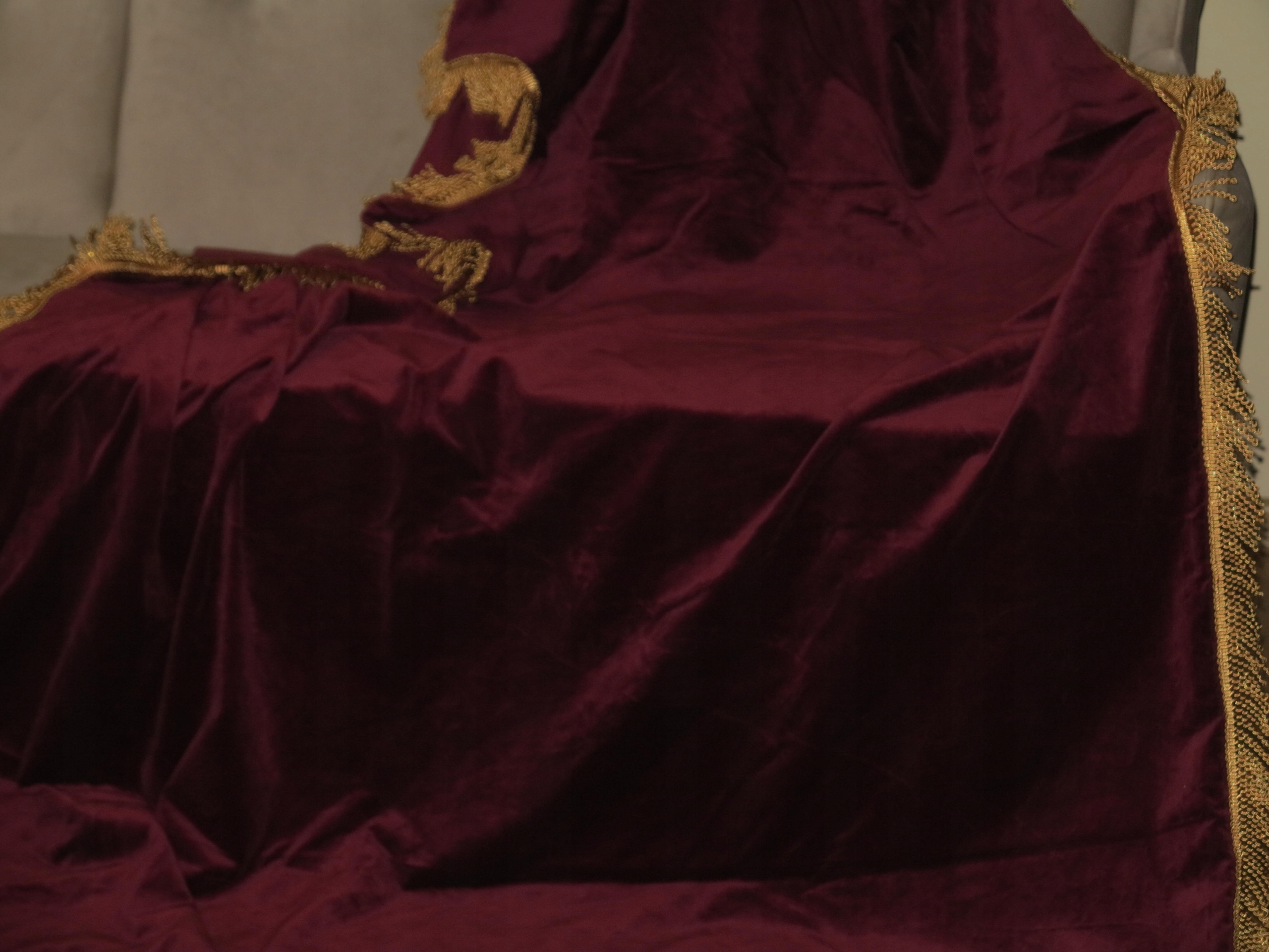 ДЛЯ АНТИКВАРНОСТИ - КРАСИВАЯ, СТИЛЬНАЯ, ОЧЕНЬ БОЛЬШАЯ СКАТЕРТЬ ИЗ ОТЛИЧНОГО КАЧЕСТВА ХЛОПКОВОГО БАРХАТА В ЦВЕТЕ «ГЛУБОКАЯ НОРА». ПРИМЕРНО ТОЛСТАЯ БАХОРА ИЗ СТАРОГО ЗОЛОТА