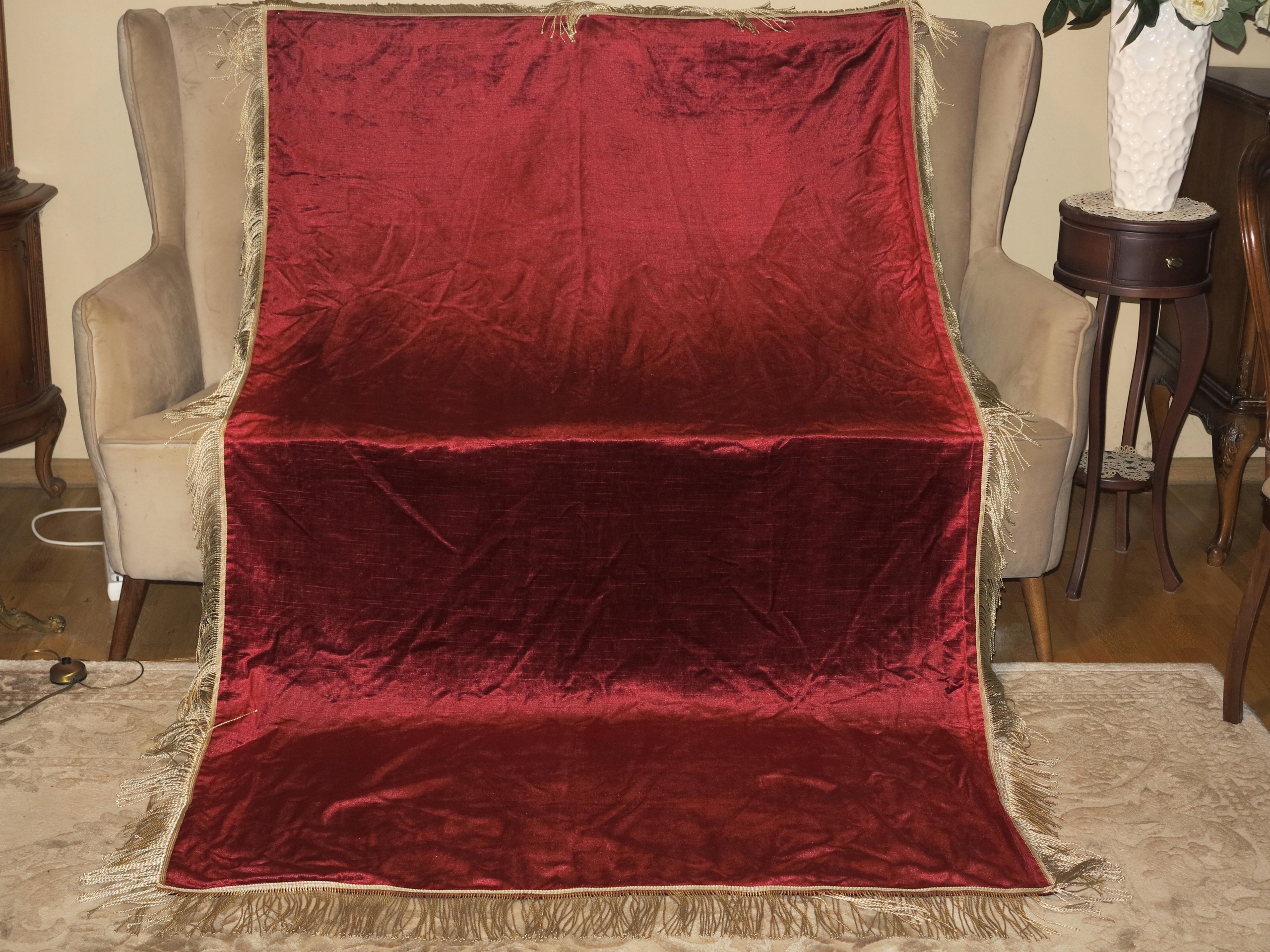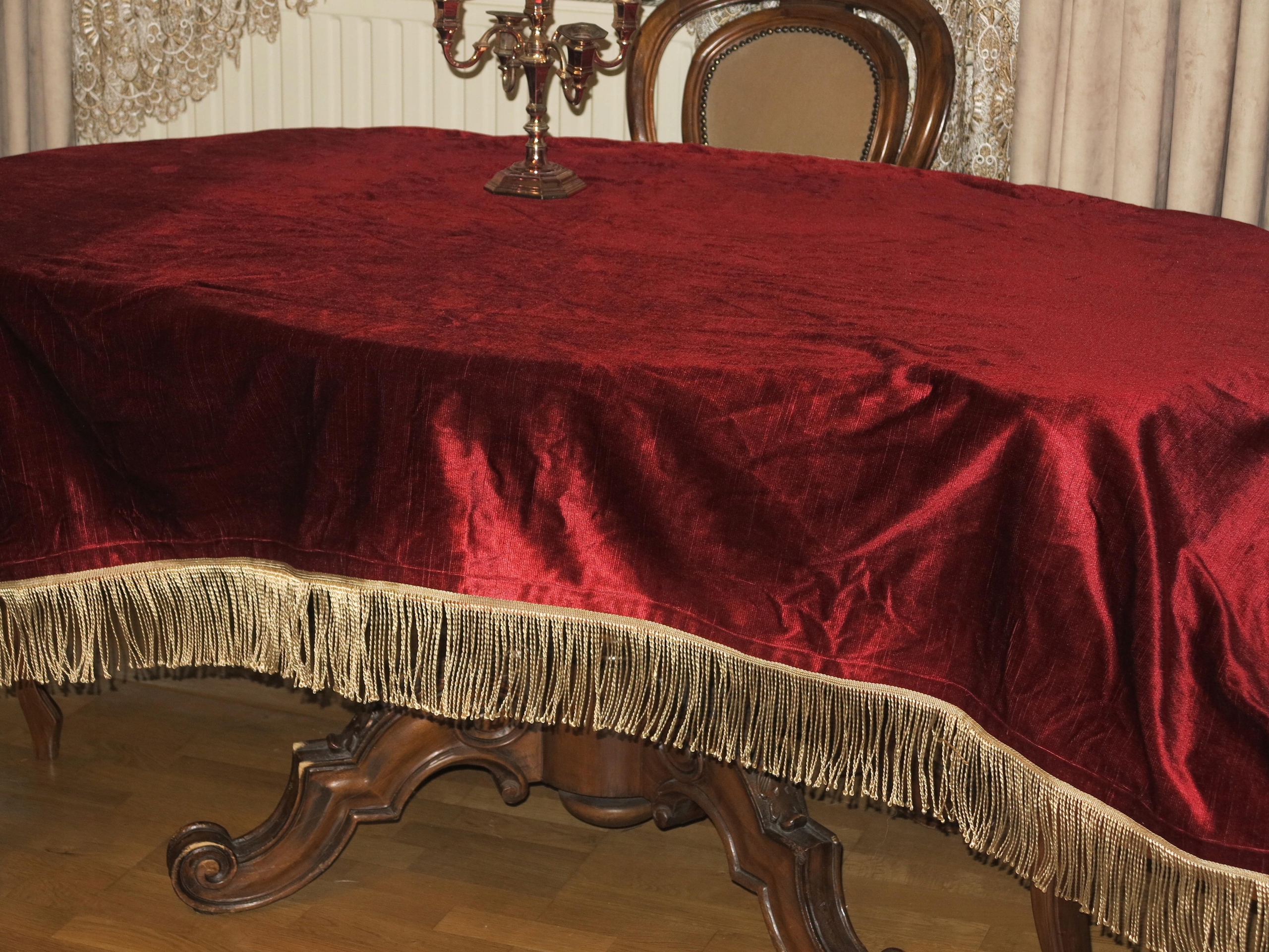Предмет аукциона – необыкновенно красивая бархатная скатерть с золотой бахромой. Размеры скатерти: длина 204 см, ширина 127 см + бахрома 11 см. Скатерть б/у, в очень хорошем состоянии. Рекомендую, это будет красивое украшение стола. Рекомендую.