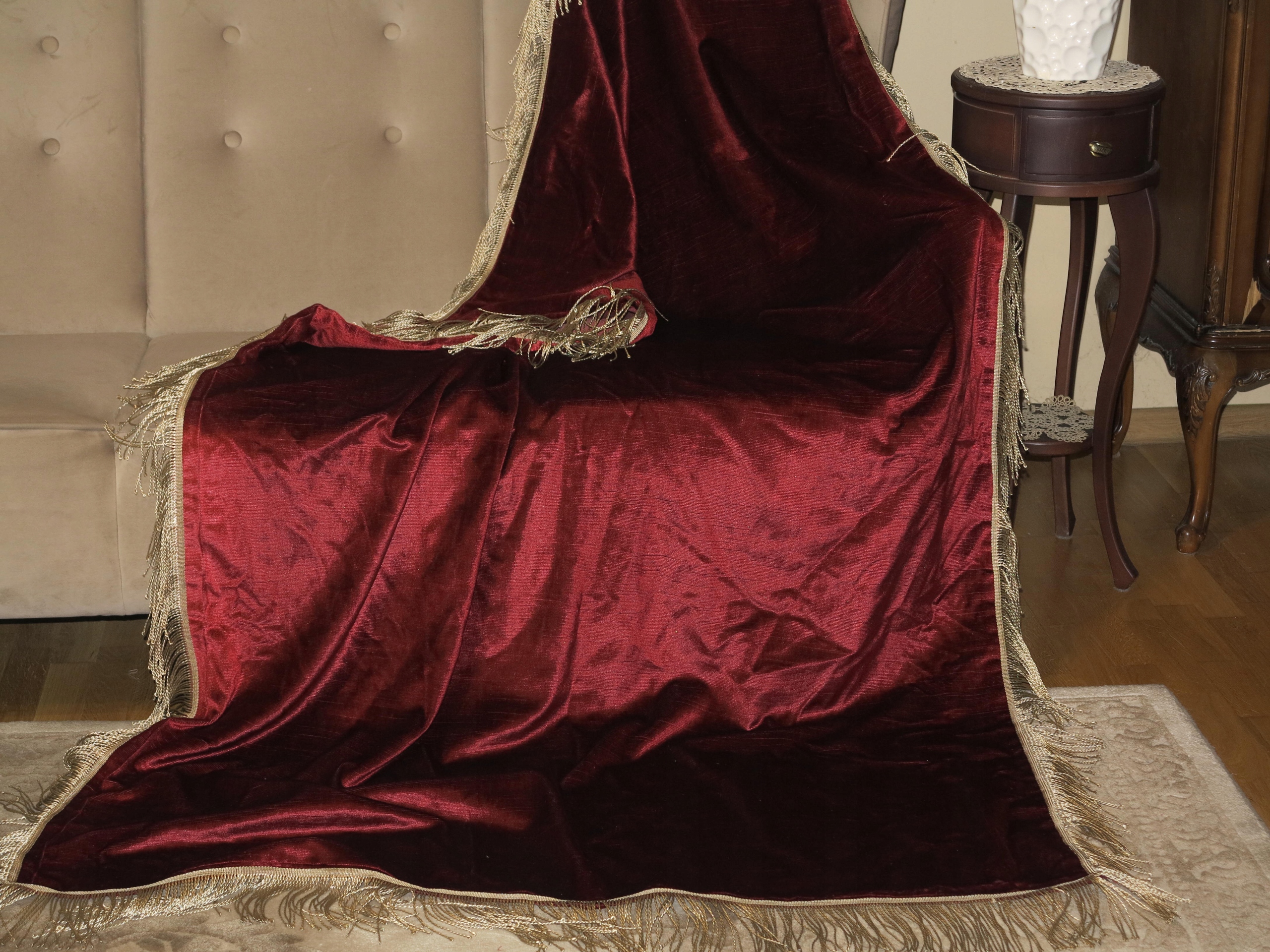 ИМЕННЫЙ И НЕОБЫЧАЙНО КРАСИВЫЙ АНГЛИЙСКИЙ СКАТЕРЬ ИЗ ПЛОТНОГО БАРХАТА НА ХЛОПКОВОЙ ОСНОВЕ, ЦВЕТА «ГЛУБОКАЯ НОРА». СКАТЕРТЬ ПО ВОКРУГУ УКРАШЕНА ЗОЛОТОЙ ДЛИННОЙ БАХОРОЙ.