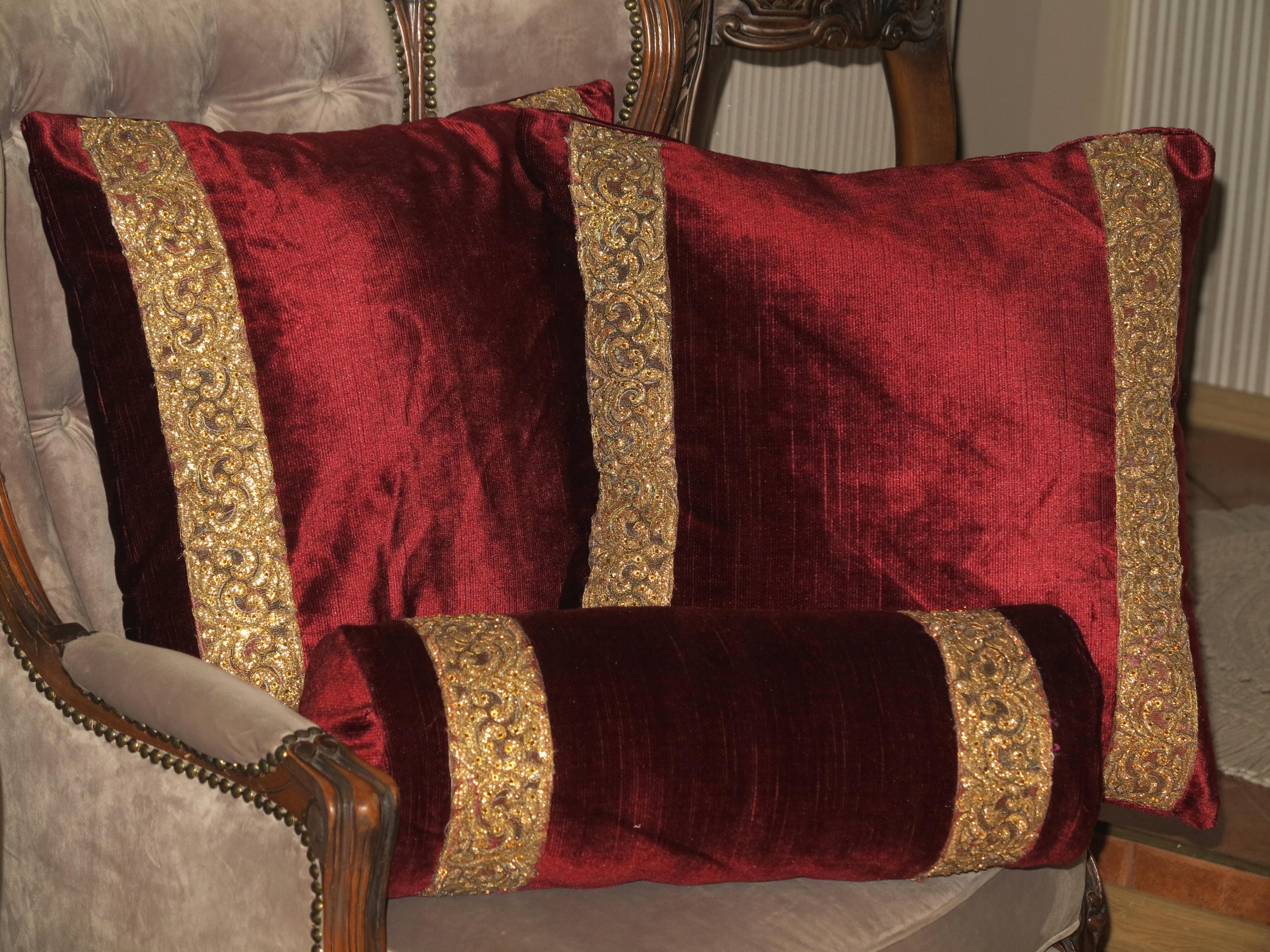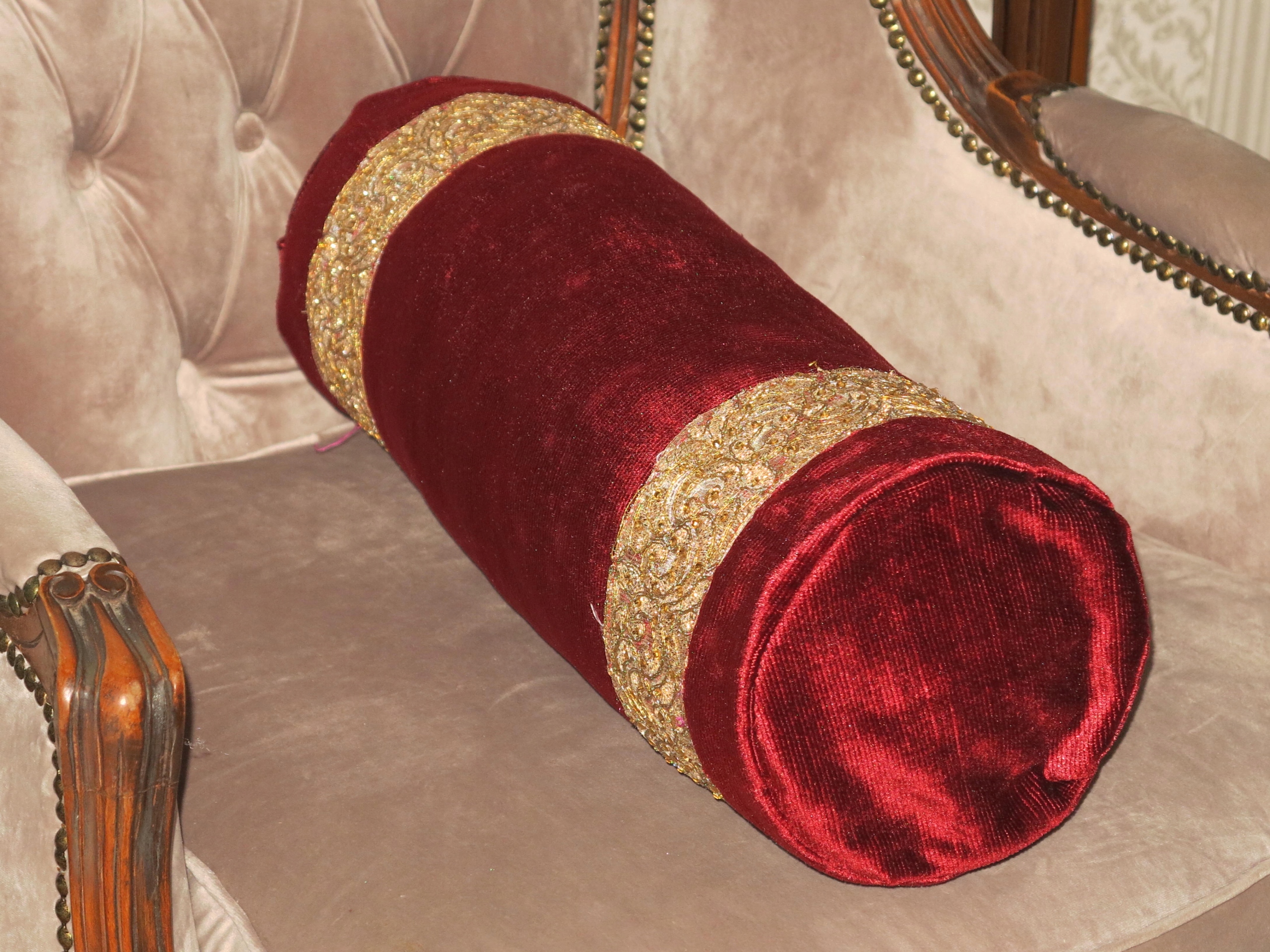 Предмет аукциона - необыкновенно красивый, стильный бархатный валик с отделкой под старинное золото. Б/у, в очень хорошем состоянии и качестве, они выглядят очень элегантно. Рекомендую