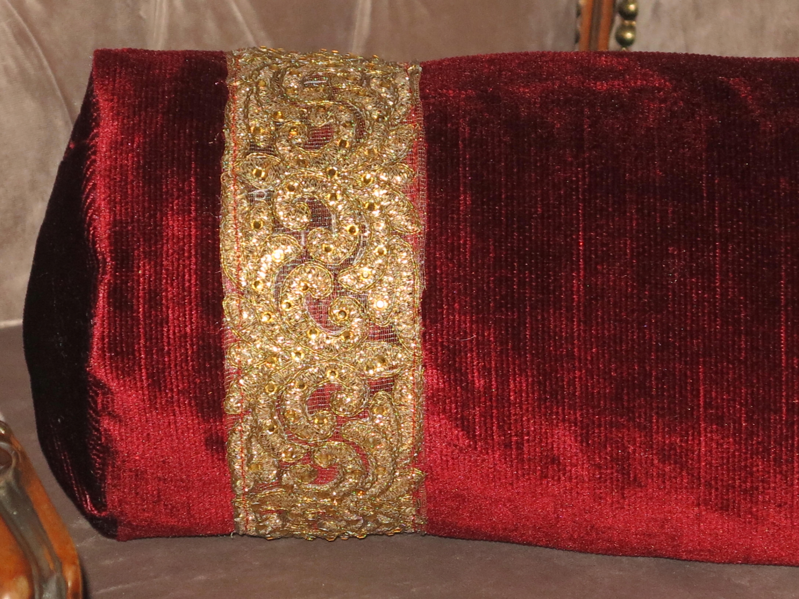 ЭКСКЛЮЗИВНЫЙ,СТИЛЬНЫЙ БОЛЬШОЙ БАРХАТНЫЙ ВАЛИК, ПОЛНОСТЬЮ ИЗГОТОВЛЕННЫЙ ИЗ БЛАГОРОДНОГО, ПЛОТНОГО БАРХАТА, ГЛУБОКОГО ЦВЕТА, УКРАШЕННЫЙ ШИРОКОЙ АНТИКОВОЙ ОТДЕЛКОЙ ИЗ СТАРОГО ЗОЛОТА