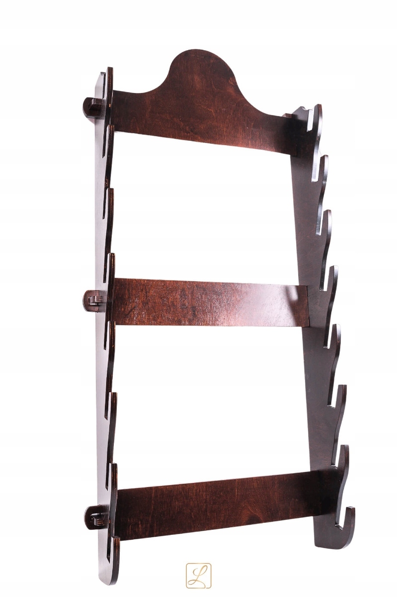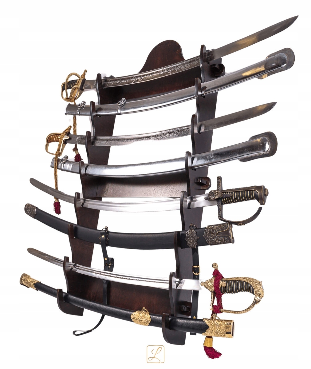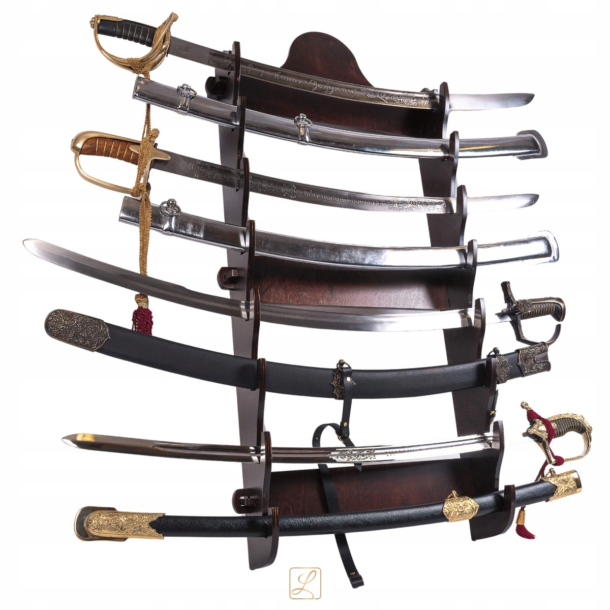 новый, сделанный из фанеры, окрашенной и лакированной вешалки до 4 комплектов сабли с влагалищем. Польский продукт - мы поддерживаем польские поделки. Мы увеличили ширину вилки до 40 см внутри, что гарантирует стабильное положение сабли - ручка не поднимает голову. Мы увеличили способность подставки до 8 позиций, каждую секунду вилку шире, чтобы повесить влагалище под саблей, которую мы показываем на фотографиях.