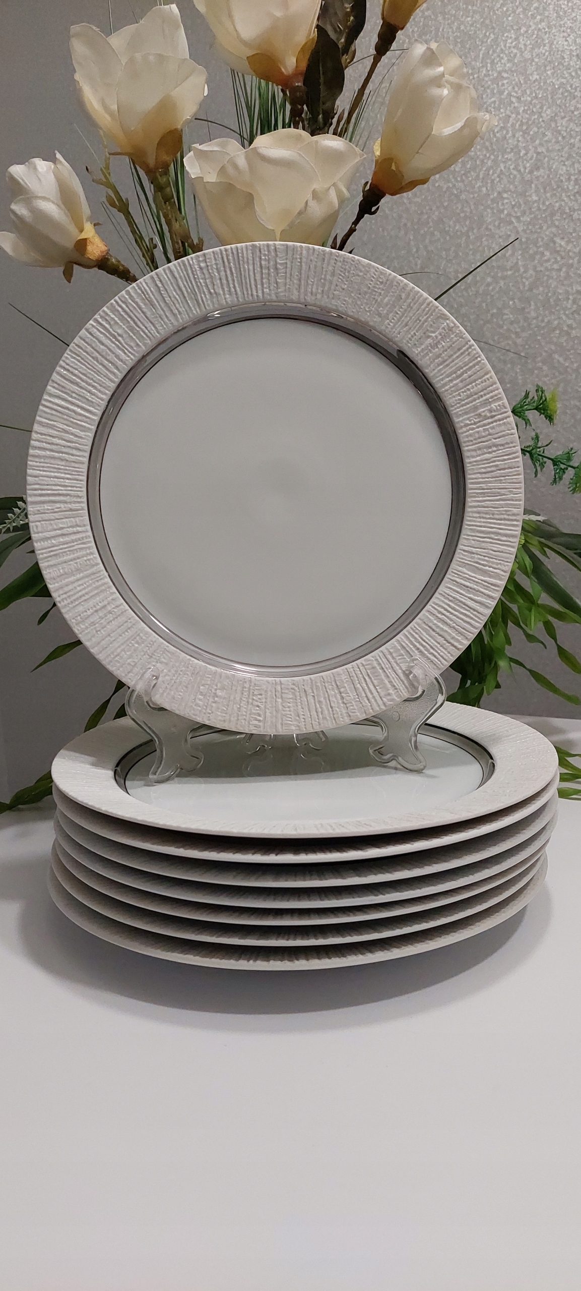 Восемь неглубоких тарелок в хорошем состоянии, диаметром 26 см. Минимальные дефекты серебра.