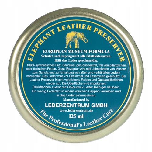 Elephant Leder Preserver – Рецепт европейских музеев. Воск пропитывает все виды гладкой кожи. Делает кожу мягкой. В его основе 100% синтетические ингредиенты. Бескислотный, без запаха, не содержит животных и растительных жиров. Рецепт воска десятилетиями использовался музеями для ухода за старинной и очень сухой кожей. Средство защищает кожу от плесени и поверхностных трещин. Воск Elephant Leder Preserver освежает цвет и золотистую отделку. После использования воска поверхность кожи пропитывается.