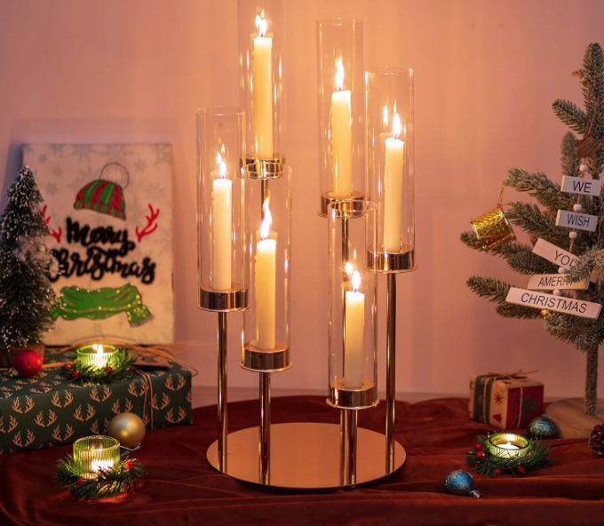 - Столы подсвечников: изготовлен из высококачественного металла и стекла с высокой прозрачностью, коническая подсвечника имеет 6 рук на горизонтальных высотах со стеклом цилиндра. Основание было спроектировано с тремя маленькими круглыми ногами для защиты мебели от потенциальных царапин. Каждый стеклянный ураган имеет правильный вес, идеальная гладкая отделка и достаточно долговечна, чтобы сохранить каждую свечу, не беспокоясь о перевороте
