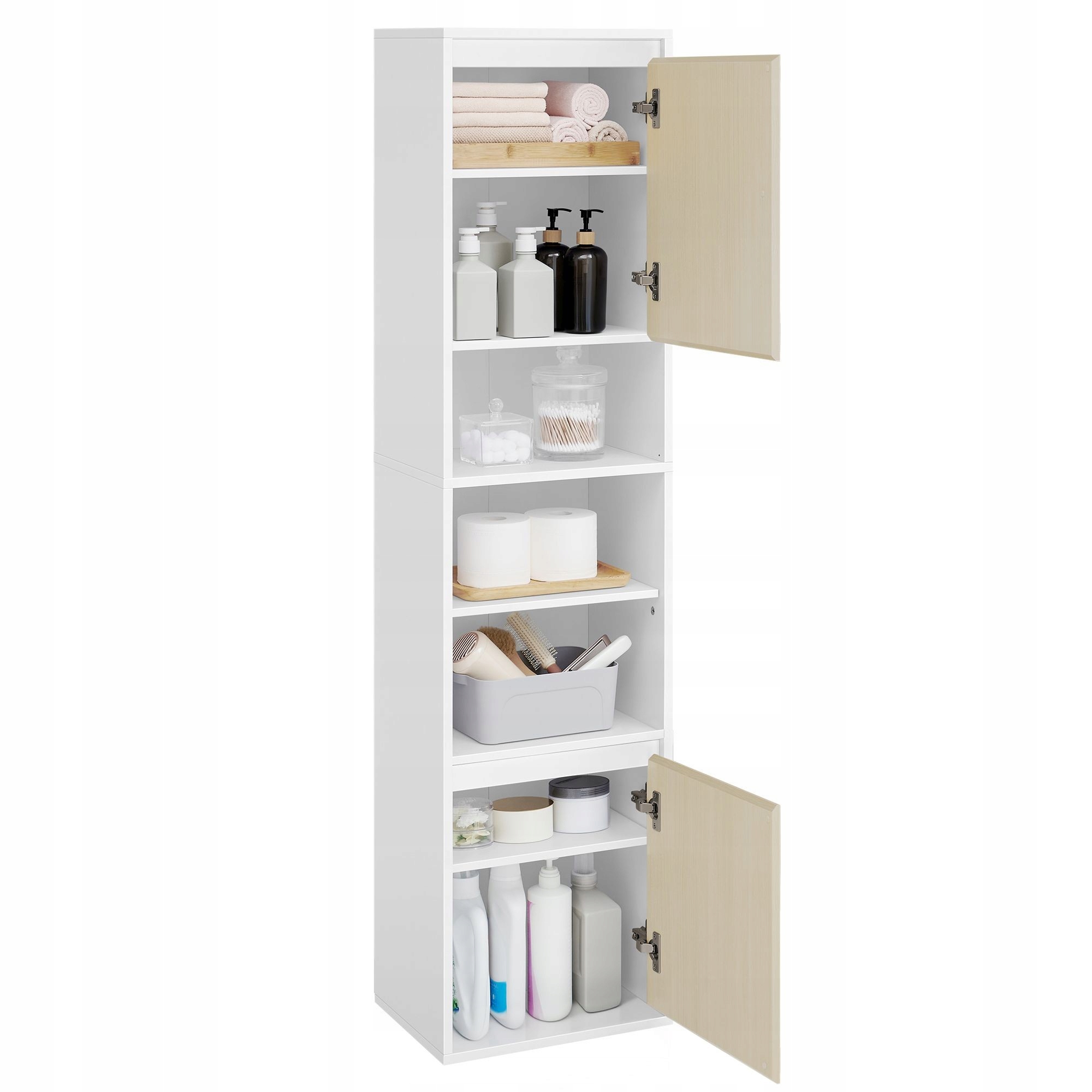 Открытые отсеки обеспечивают быстрый доступ к наиболее часто используемым вещам, а закрытые шкафы с дверцами эффективно защищают конфиденциальность и помогают скрыть беспорядок. Дверцы можно установить слева или справа, адаптируя шкаф к планировке ванной комнаты, а скошенные края обеспечивают легкое открывание и закрывание. Шкаф имеет 7 отделений, в том числе 3 регулируемые полки, которые можно регулировать по высоте, что позволяет хранить предметы разных размеров, обеспечивая функциональность и элегантный вид вашей ванной комнаты.