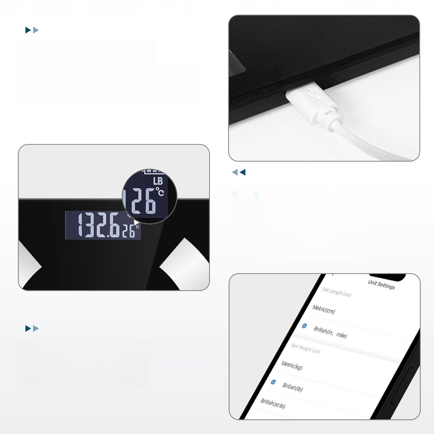 - Вес для измерения жира загружается через USB и имеет встроенную литиевую батарею, которая после полного заряда достаточно для 2-3 месяцев использования.