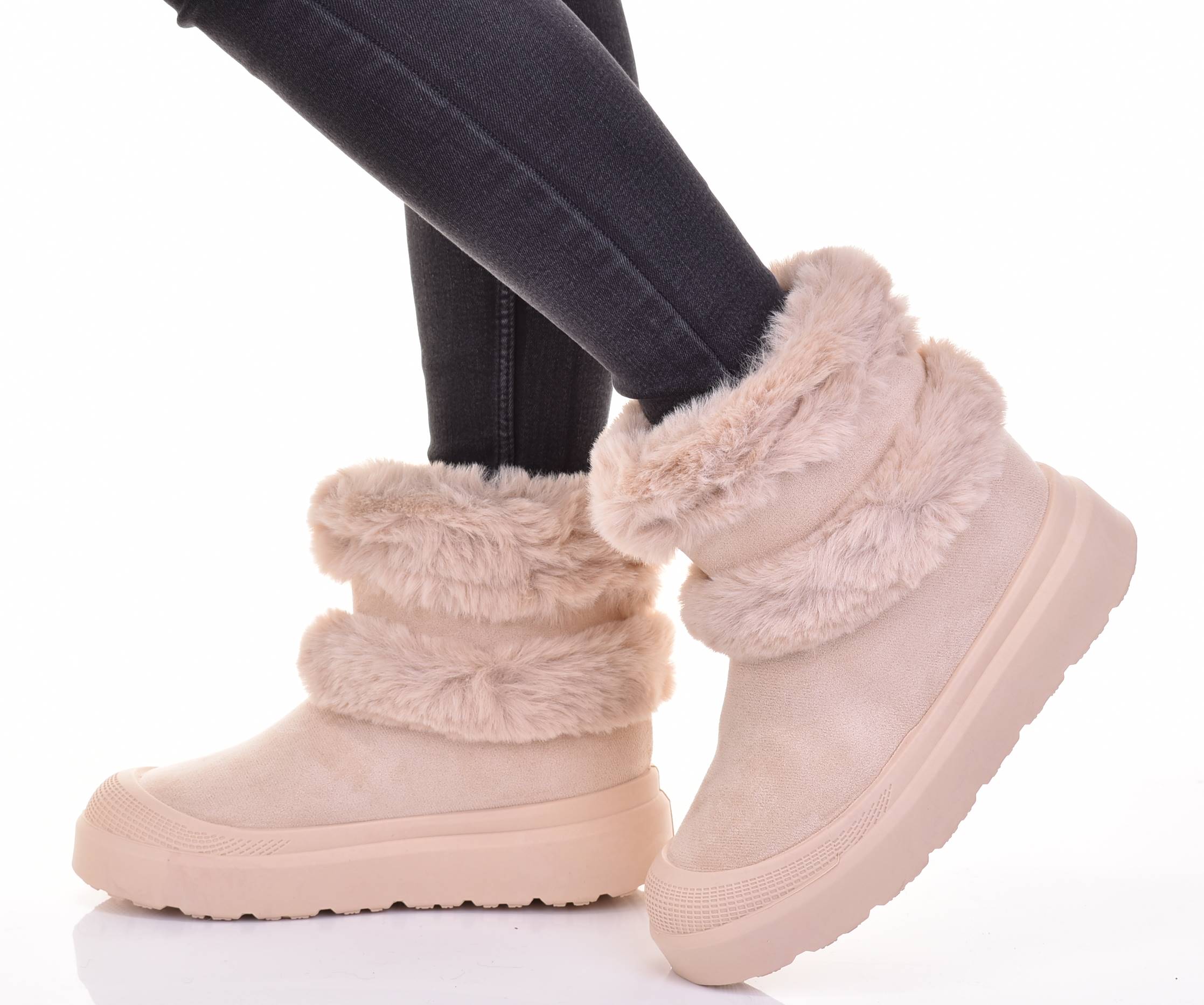 Снежные ботинки имеют твердую густую изоляционную подошву, сделанную из холодной из резины. Верхняя часть изготовлена из высококачественной экологической замши, украшенной мехом.