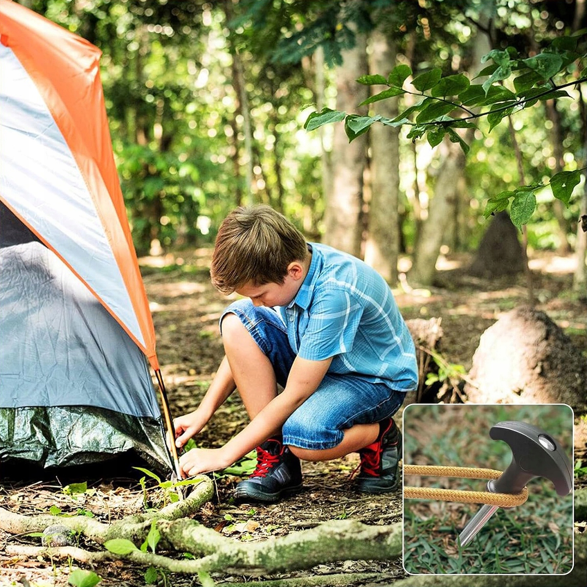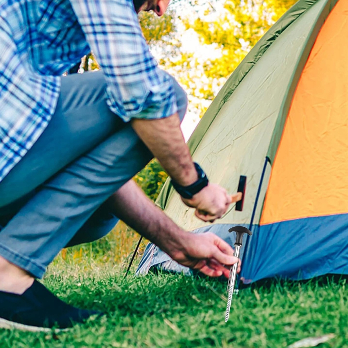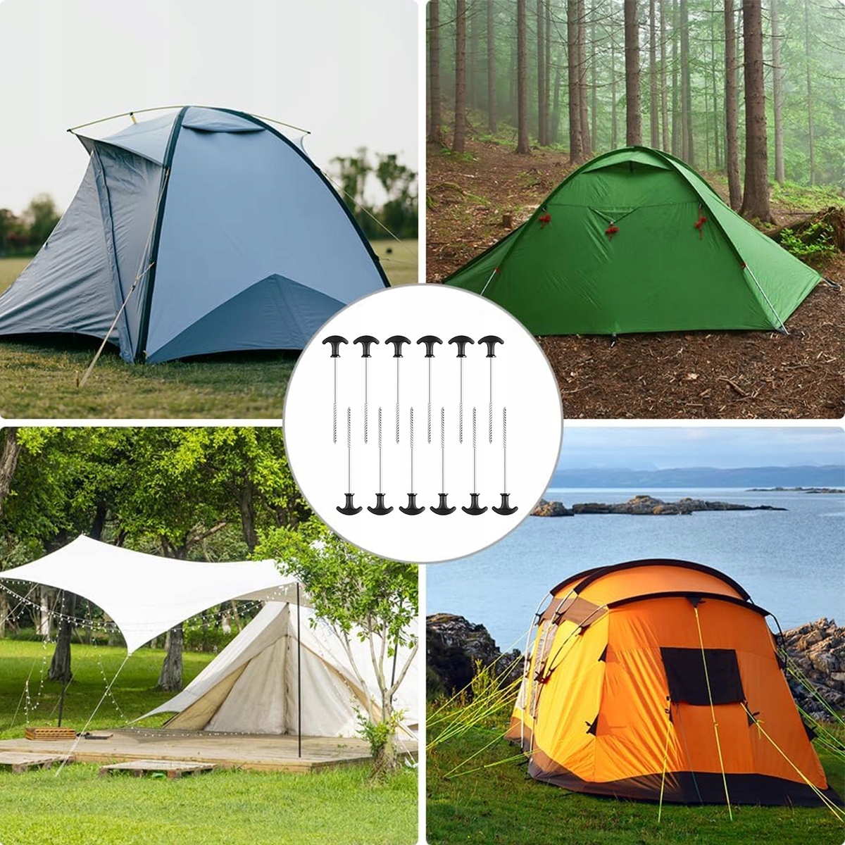 🏕 【Более толстая винтовая конструкция】 Графики палатки оснащены черными T -образными ручками (материал PP), которые согнуты, чтобы они вписывались в пальцы, чтобы вы могли легко закрутить булавки в землю и безопасно вытянуть их.
