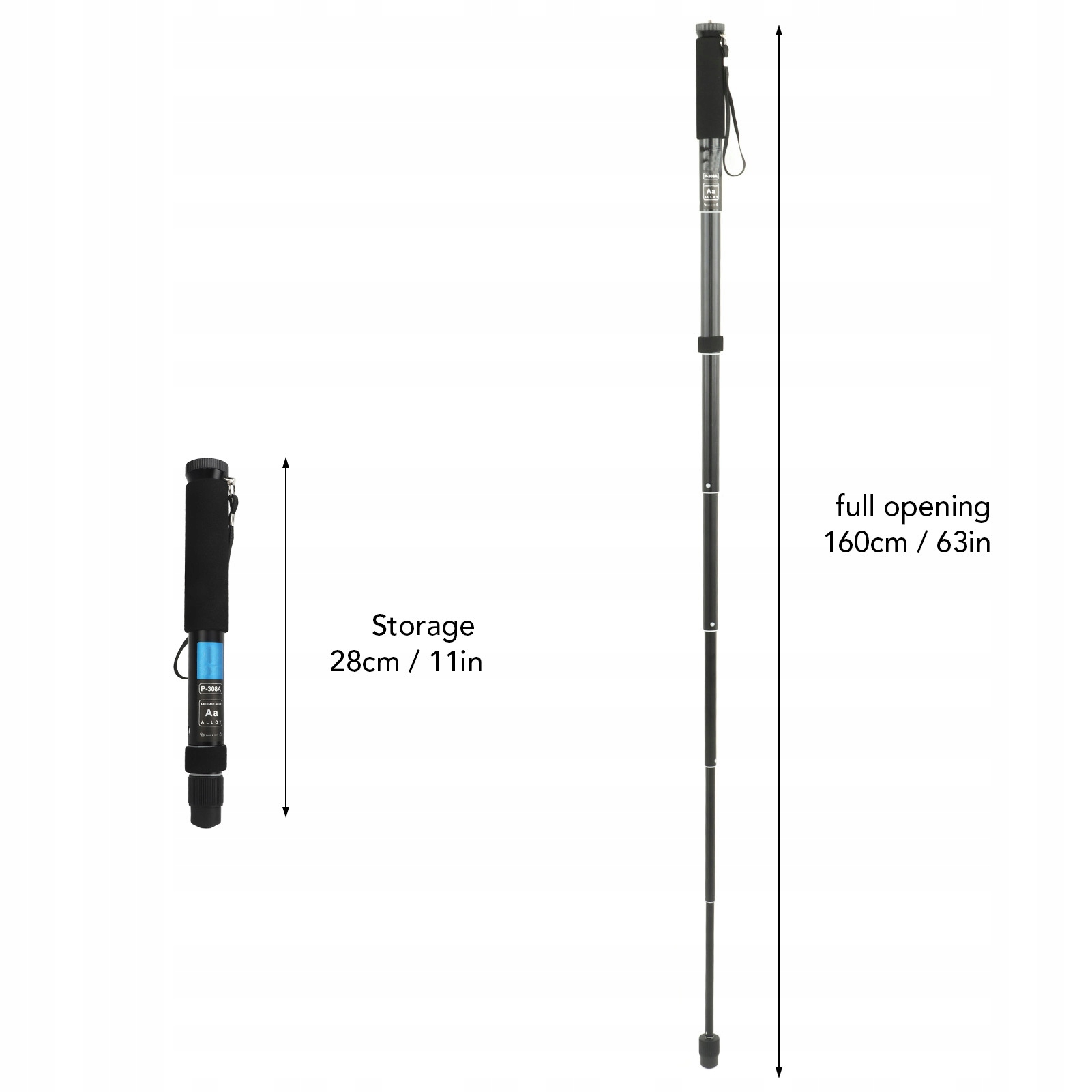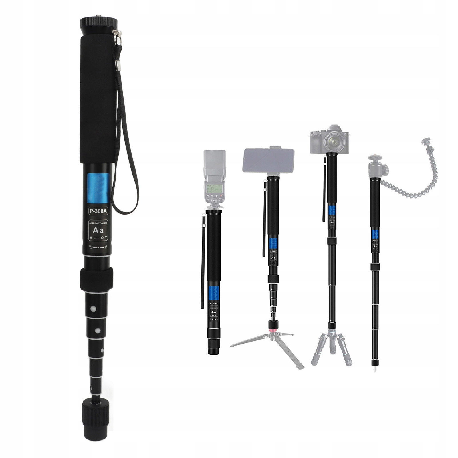 Особенность: 1. Алюминиевый сплав: выдвижной монопод изготовлен из высококачественного алюминиевого сплава, прочного и долговечного. Выдвижная конструкция ножек: всего три шага, чтобы разложить или хранить ножку.