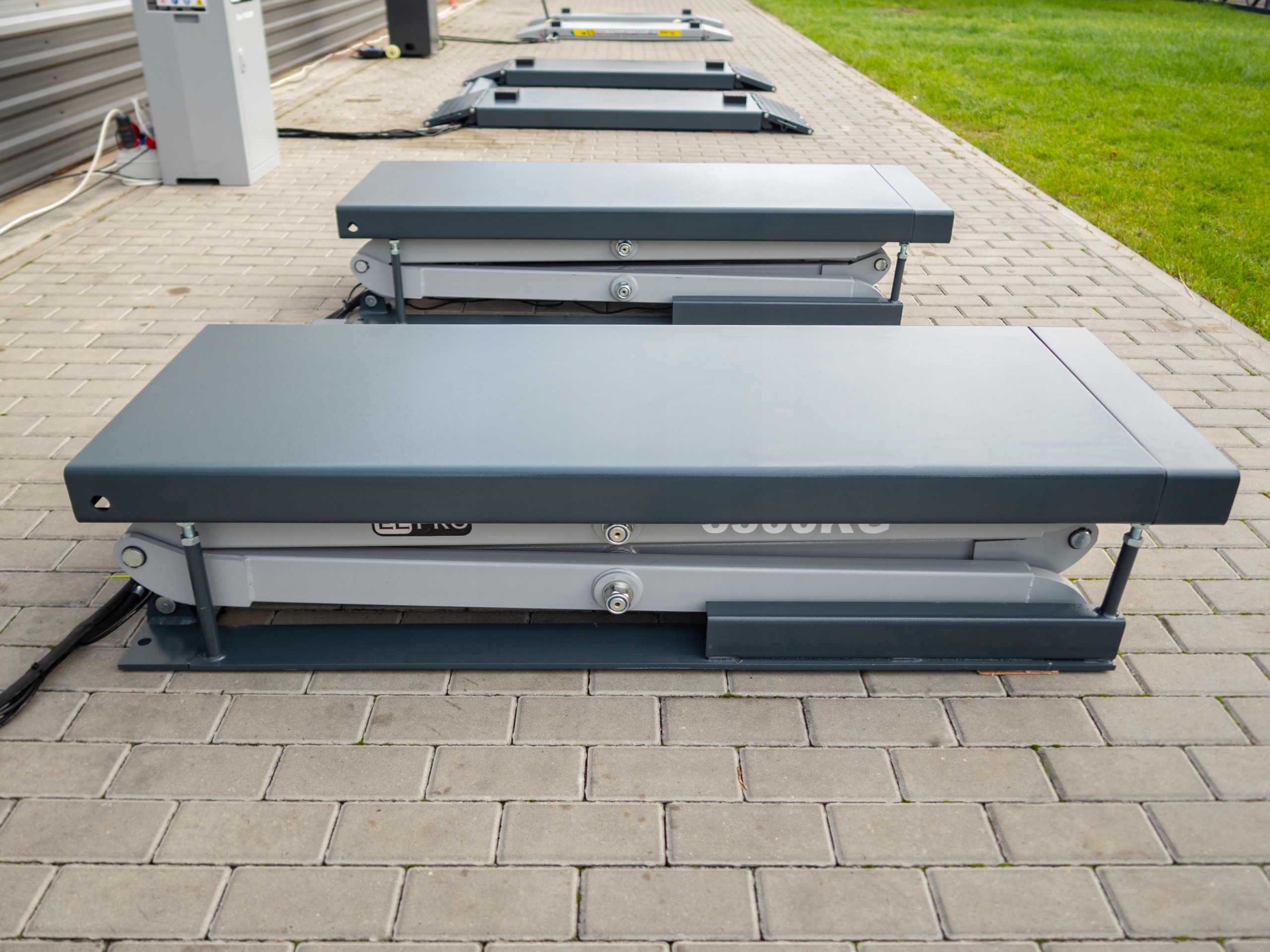 Для этого лифта необходимо соорудить фундамент-ванну, благодаря чему в сложенном состоянии лифт прячется в полу и мы получаем ровную входную поверхность и дополнительную место в мастерской, где, например, две станции технического обслуживания расположены в одну линию. Первая станция, на которой установлен ножничный подъемник, одновременно является точкой доступа на вторую станцию.