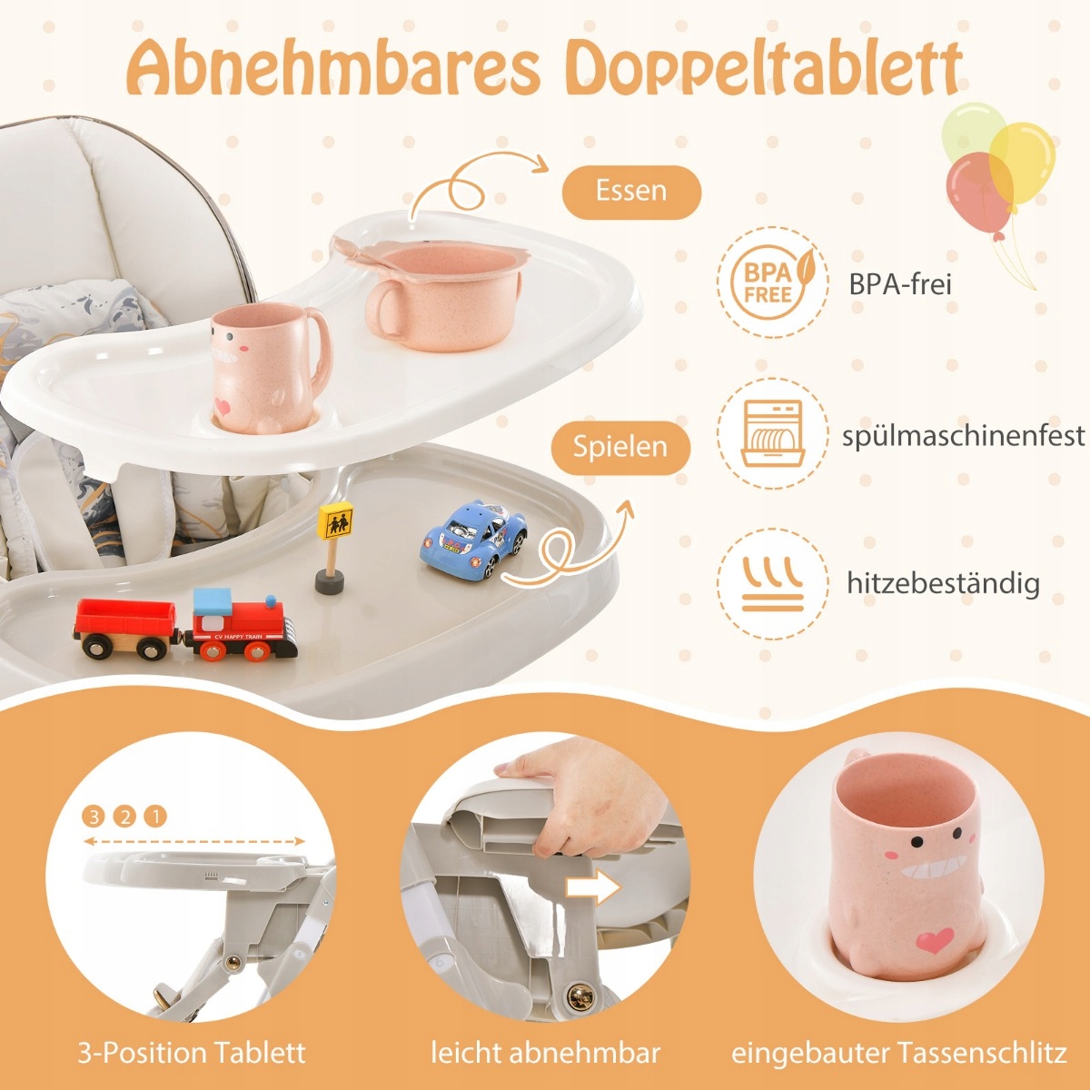 Благодаря регулируемым функциям, таким как высота 6 сидений, 3-уровневая спинка, 3-ступенчатая подставка для ног и съемные двойные лотки, ваш ребенок может сидеть комфортно и даже больше наслаждаться едой. Изготовленный из прочного PP и прочного металла, этот высокий стул обеспечивает вашему ребенку максимальную безопасность и стабильность.