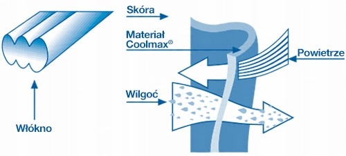 Coolmax® — современное полиэфирное волокно, предназначенное для производства термоактивной одежды. Он характеризуется хорошими вентиляционными свойствами и помогает сохранять поверхность кожи сухой. По сравнению с натуральными волокнами Coolmax® обеспечивает гораздо лучшую воздухопроницаемость и отведение влаги. Это связано с особым строением волокна, поперечное сечение которого состоит из четырех или шести кругов с сужениями между ними.