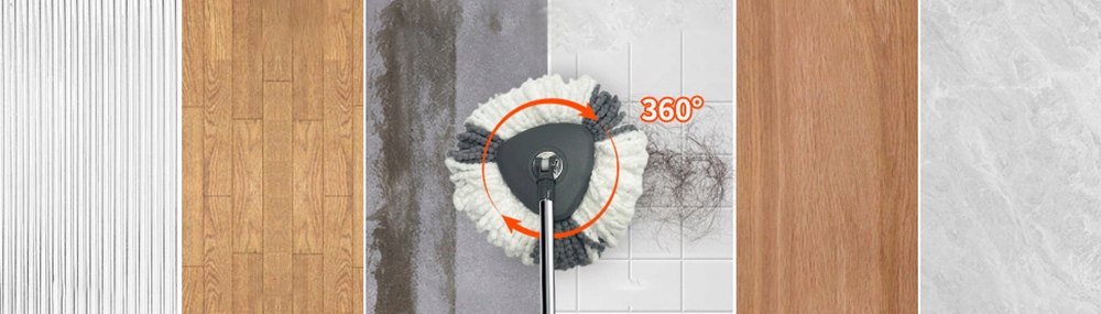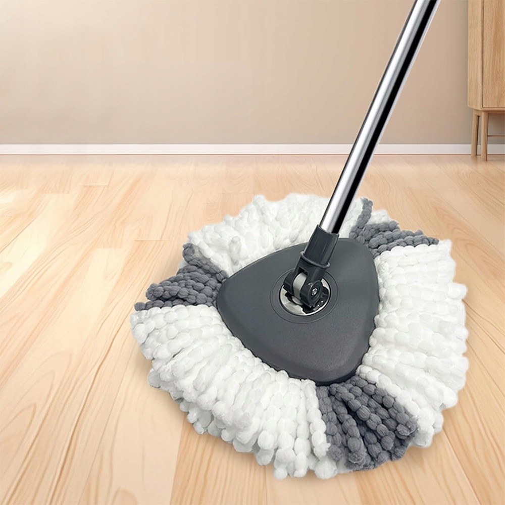Треугольная насадка швабры гибко вращается на 360°, что позволяет легко добраться до углов, краев и других труднодоступных мест; подходит для различных типов напольных покрытий, таких как ламинат, дерево и плитка, гарантируя отсутствие мертвых зон.