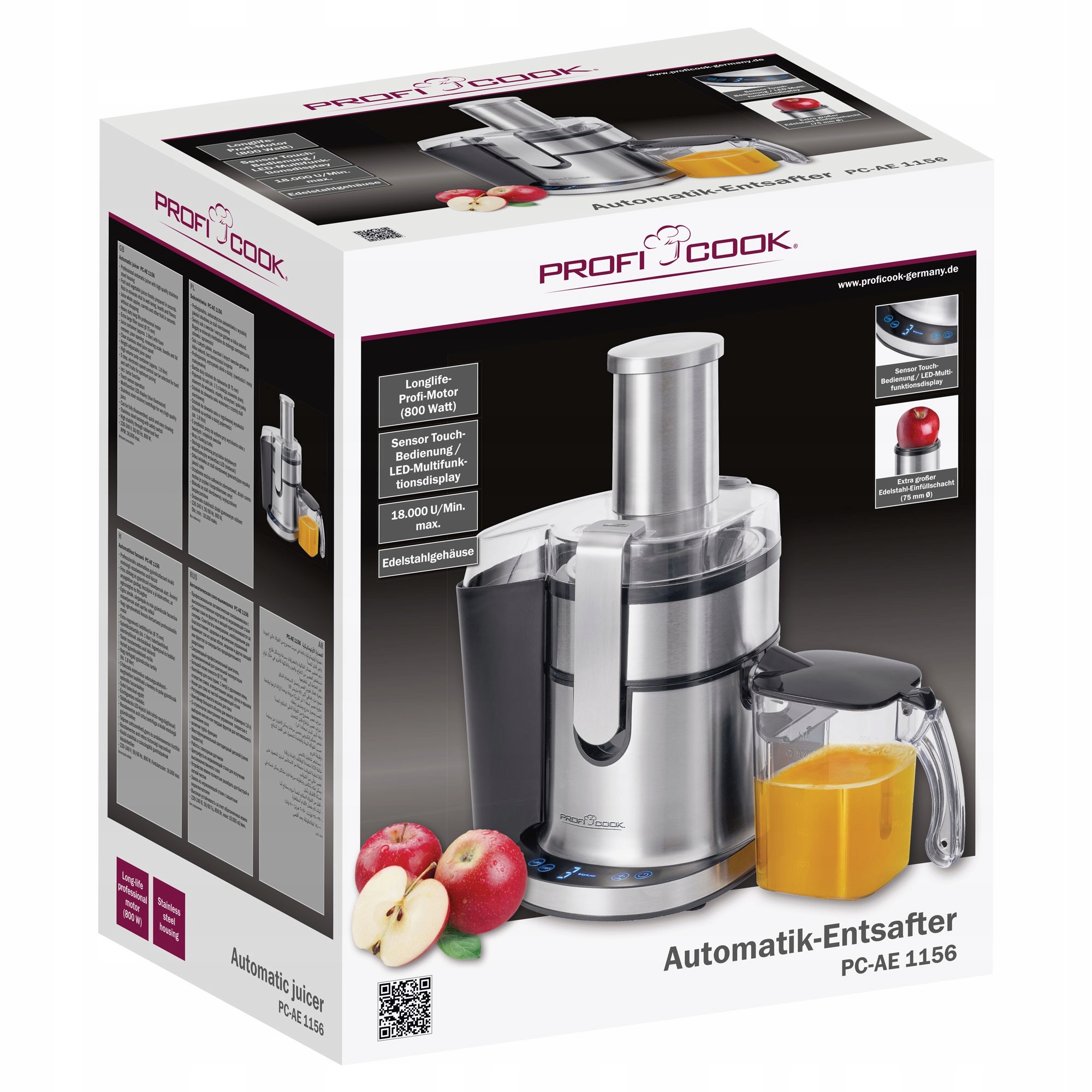 Высокоскоростной Proficook PC-EAE 1156 W. Благодаря устройству, благодаря устройству вы быстро готовите морковь, яблоки, апельсины, свеклу, персики и другие фрукты и овощи. Соковыжималка позволяет быстро приготовить большое количество сока благодаря высокой мощности двигателя и удобному кувшину с 1 литрами.
