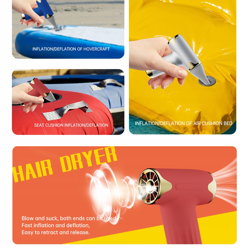 - Компактный и легкий, удобный для переноски, с насадкой для сбора ветра, может использоваться для спортивной ходьбы, сушки волос, пылесоса клавиатуры, надувания и сдувания надувных лодок/воздушной подушки, горящего барбекю и так далее.