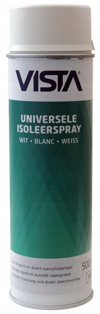 VISTA UNIVERSELE ISOLEERSPRAY — быстросохнущая герметизирующая грунтовка с отличными изоляционными свойствами, предназначенная для внутреннего и наружного применения. . Его можно использовать для маскировки пятен и изменений цвета, вызванных табачным дымом, сажей, ржавчиной, намоканием, влажностью, а также жирными загрязнениями. Идеально подходит для использования во всех местах, где обычные краски для внутренних работ не закрывают сложные пятна на стенах и потолках.