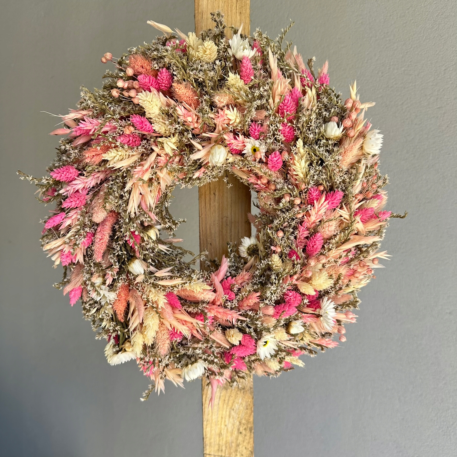 венок в оттенках розового, белый изготовлен вручную в Польше из натуральных, сушеных растений-реличик, цветов и трав, которые являются настоящим даром природы. Каждая копия представляет собой тщательно расположенную композицию, без добавления искусственных элементов. Это украшение, которое впечатляет его легкостью, подлинностью и вневременным очарованием.