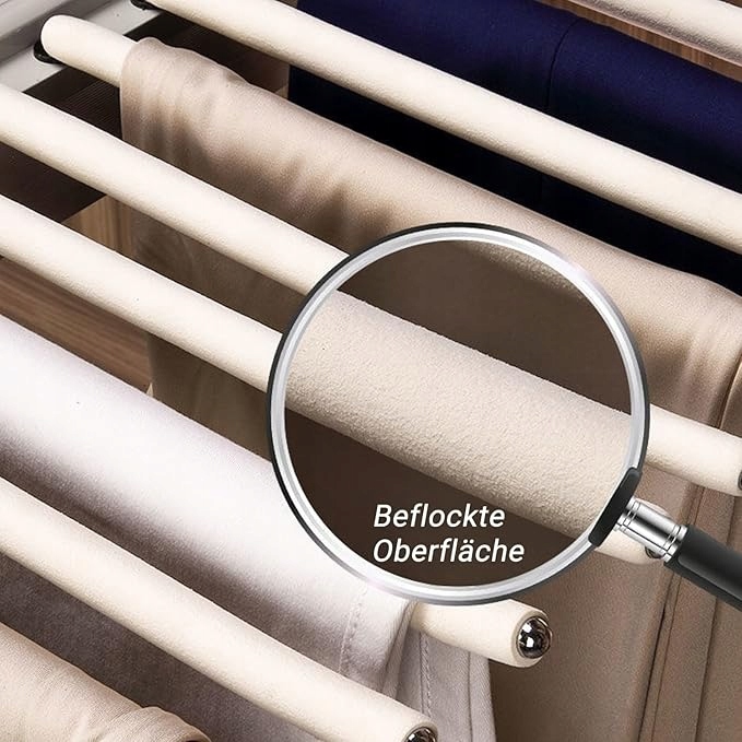 ✅Выдвижная вешалка имеет 22 стержня из нержавеющей стали, обернутых флокированным материалом, что предотвращает скольжение брюк и сохраняет их форму без складок.