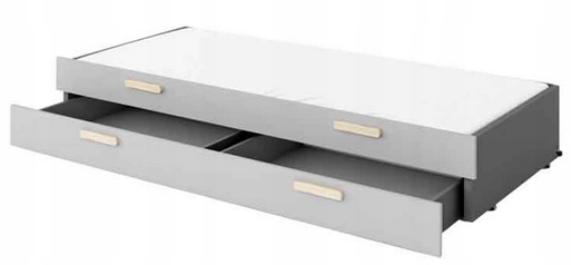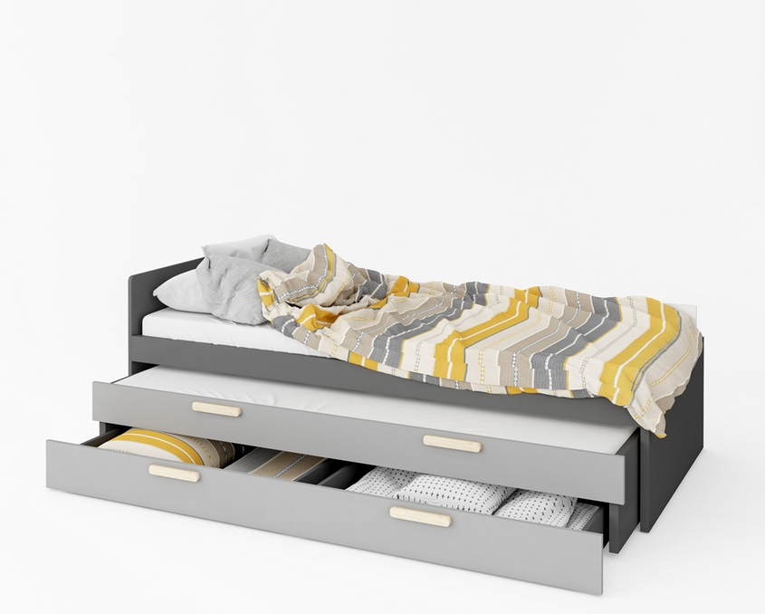 Кровать для ребенка или подростка. В стоимость верхней кровати входит удобный матрас Bonnell. Универсальный графитовый цвет кровати позволяет легко ее вписать в любой интерьер и с другой мебелью. Нижняя кровать имеет выдвижной ящик на колесиках, поролоновый матрас и контейнер для постельного белья, хорошо подойдет в комнату маленького брата или сестры. случайное спальное место, например, для гостей, принимающих ребенка. Сочетание трех цветов – светло-серого, графитового и декора под дерево выглядит современно, и в то же время очень универсально и обеспечивает легкое размещение в любом интерьере. Мебель изготовлена из прочного ламинированного картона с прочной кромкой ABS. Ручки из древесины бука.