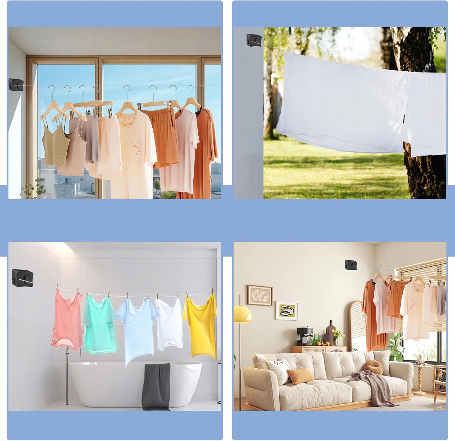 - Может использоваться для сушки одежды, полотенец, постельного белья, банных полотенец и других предметов повседневного обихода. Очень подходит для отелей, дворов, террас, балконов, ванных комнат, прачечных и т. д.