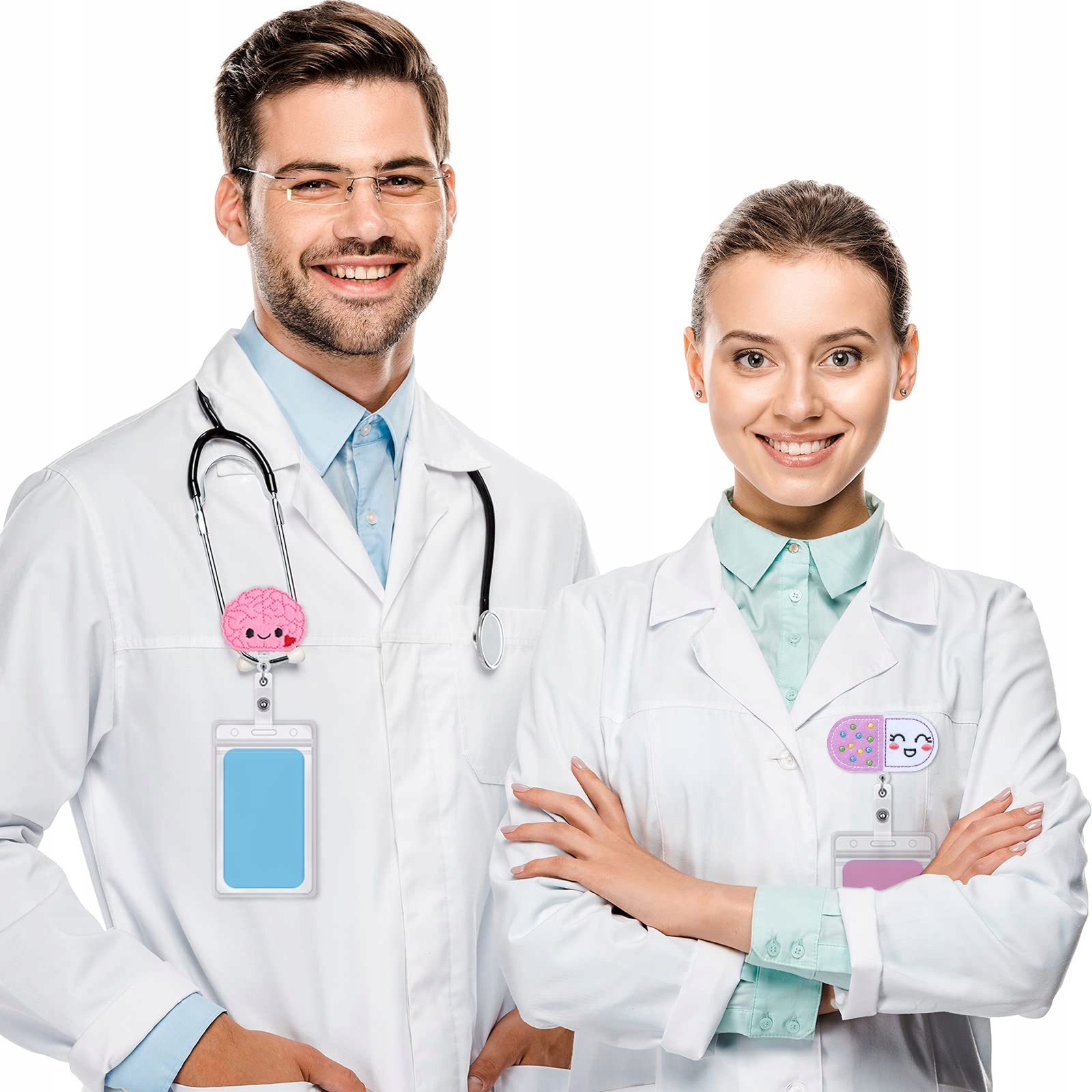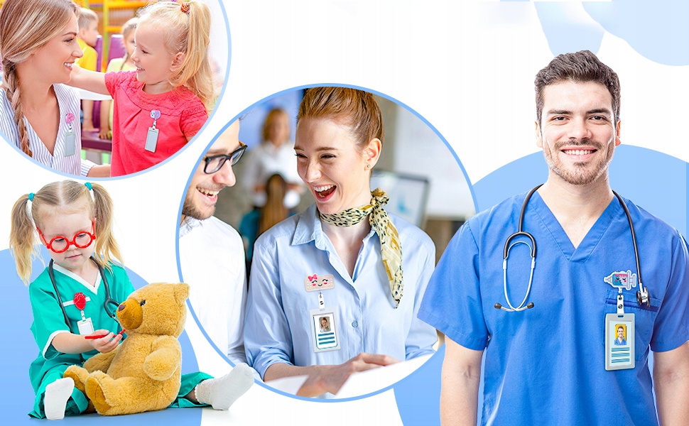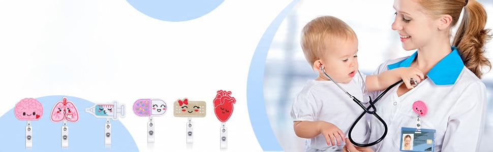 Прочный материал: фетровая таблетка, бинт, шприц, значок сердца, мозга и легких, хорошо прикрепленный на катушке прочный и долговечный, выдвижной держатель удостоверения личности, достаточно прочно крепящийся к униформе; Держатель идентификационного бейджа не упадет и не повредит одежду, поэтому его можно носить в любое время.