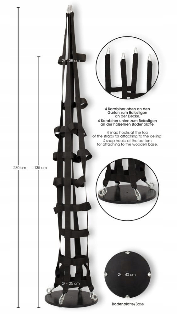 Висящая клетка плена передает ваши доминирующие / покорные игры на совершенно новый, очаровательный уровень. Партнер сильно и тесно вставил на смущающие полосы, и на самом деле нет пути побега. Кроме того, все в клетке является твердым и стабильным, что обеспечивает безопасное веселье - от деревянной основы, устойчивой к ломаным ремням до сильных карабинеров. Висящая клетка установлена в мгновение ока, просто зацепив полосы с помощью карабинеров на деревянной основе. Теперь партнер (максимальный допустимый вес составляет 100 кг - по словам производителя) стоит на деревянной платформе, а ремни растягиваются вокруг его тела. Затем прикреплены к концу карабинеров и подвешены.