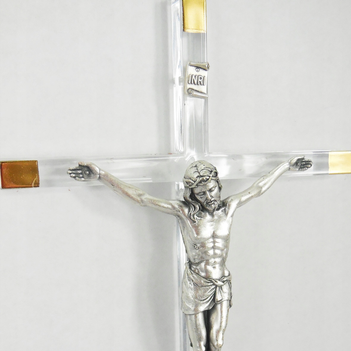 Мы предлагаем эстетически сделать висящий крест с высотой 21 см. Поперечные лучи изготовлены из высококачественного плексигласского пластика, который выходит из стекла. Балки отделаны золотыми металлическими крышками. Тщательно сделанная страсть была изготовлена из медного кастинга. Благодаря использованию современного пластика, крест имеет легкую форму, он выглядит очень эстетически приятным. Идеально подходит для современных интерьеров.
