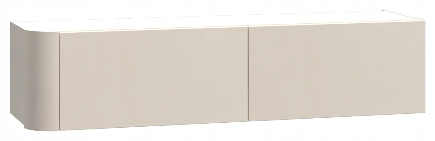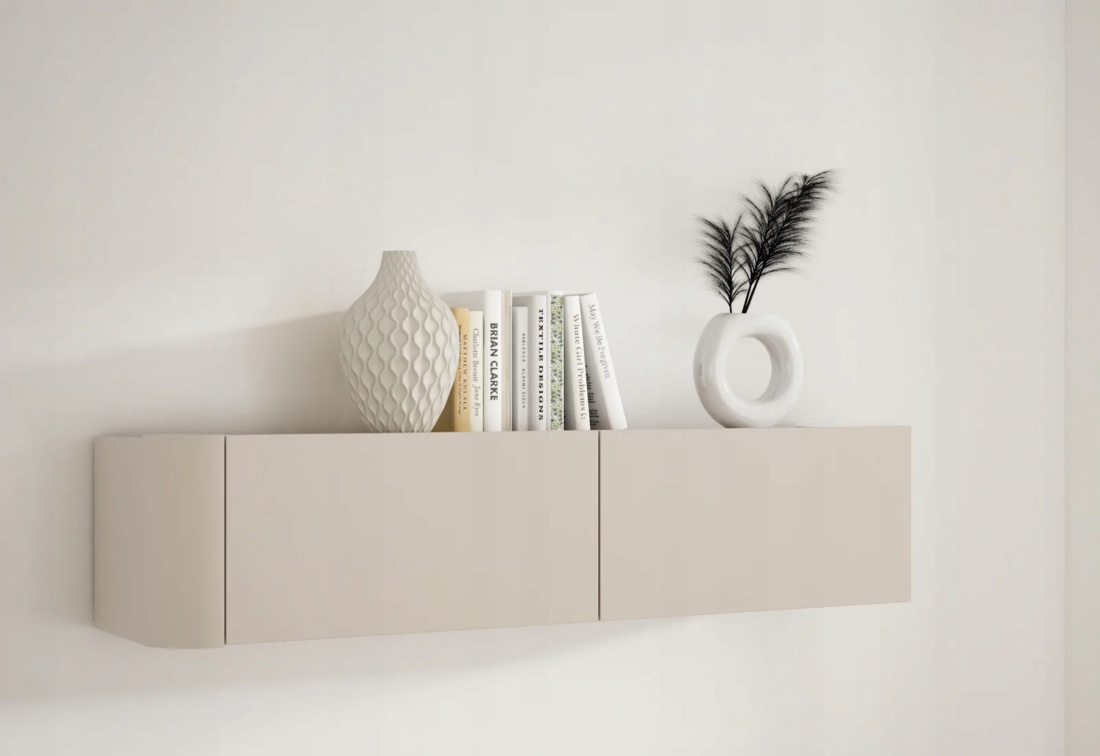 Представленный современный шкаф играет роль настенной полки и мебель для дискретного хранения. Это не занимает площадь пола, благодаря которой он также имеет легкую форму. Дополнительным преимуществом является его яркий окраску на песчаный декор, который отражает легкий, оптически, увеличивая комнату. Книжный шкаф имеет гладкий блок без вытягивания ручков мебели. Он также равномерно закончен, что придает ему элегантный вид. Поэтому это со вкусом фон для более выразительных декоративных аксессуаров. Он также легко сочетается с более интенсивными, более темными цветами другого оборудования.