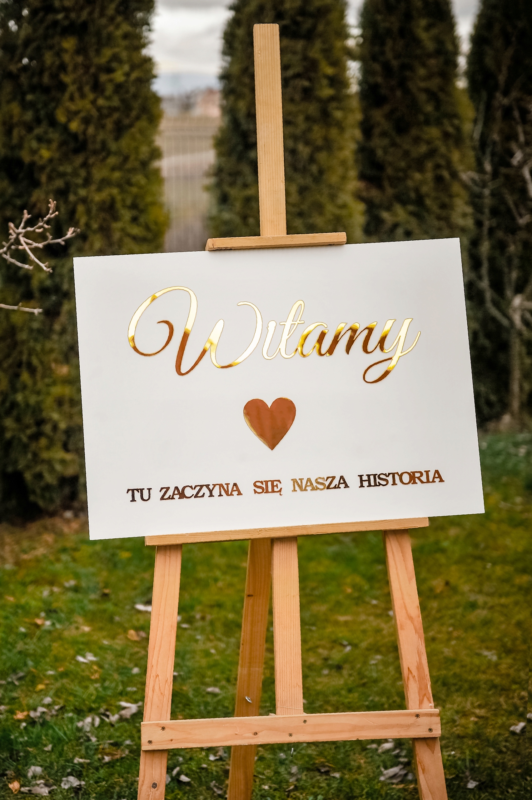 Красивое украшение, встречающее гостей перед домом и перед свадебным залом. Надписи сделаны методом лазерной резки из золотого зеркала и наклеены на белые плиты МДФ.