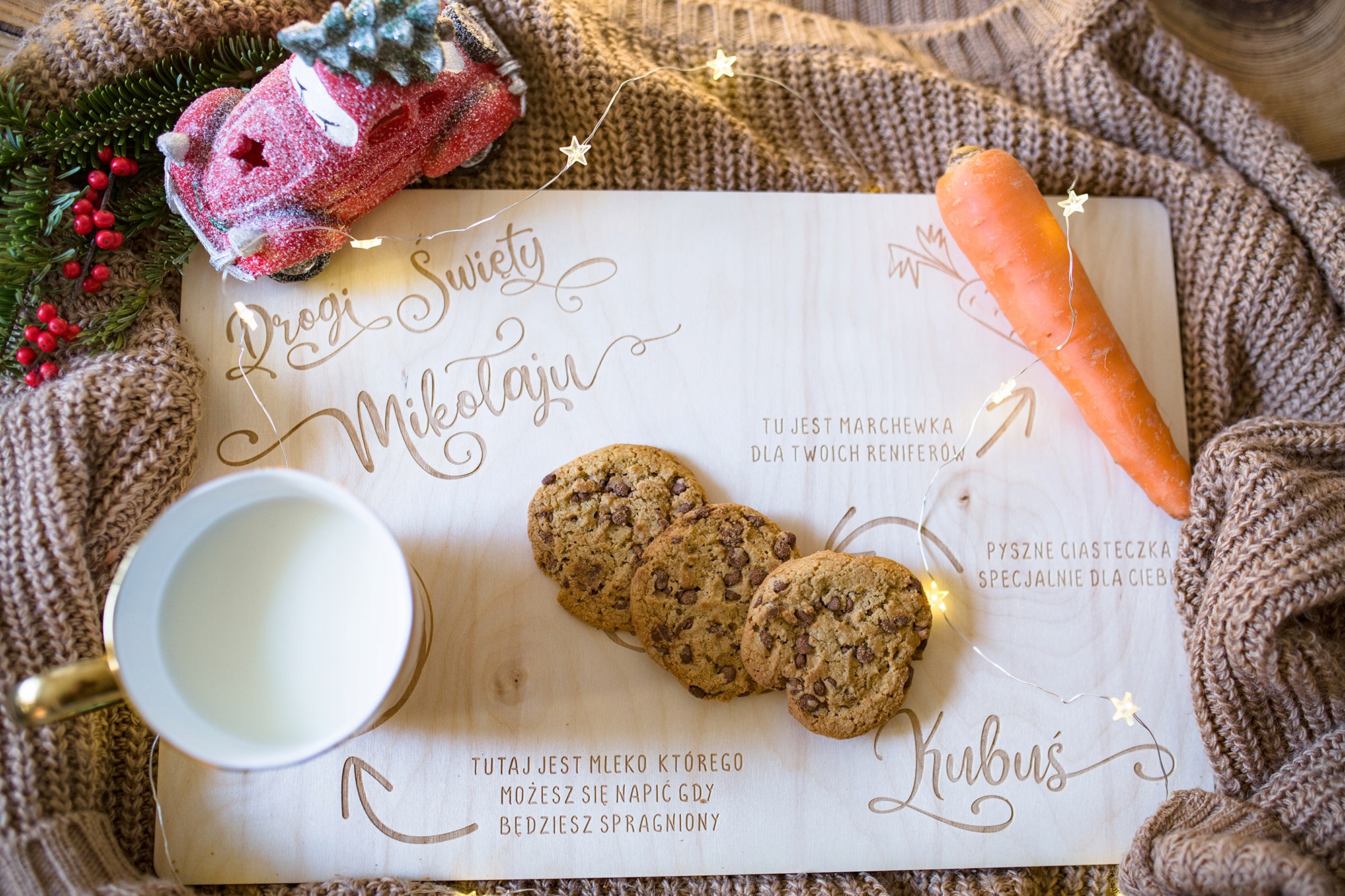 На подносе есть выгравированные подсказки о том, куда положить угощение, и персональная благодарность вашему ребенку за подарки.