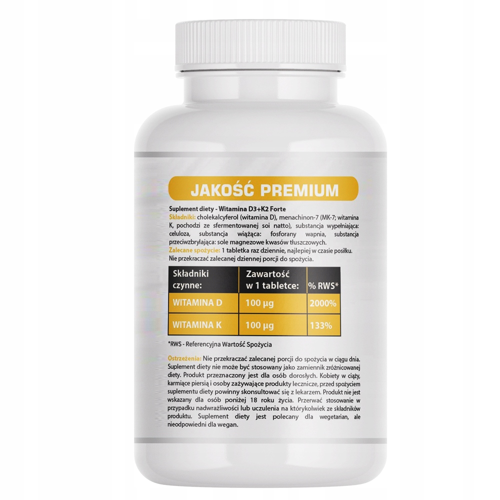 Ингредиенты: холекальциферол (витамин D), менахинон-7 (МК-7; витамин К, получен из ферментированных соевых бобов натто), наполнитель: целлюлоза, связующее вещество: фосфаты кальция, средство против слеживания. средство: магниевые соли жирных кислот.