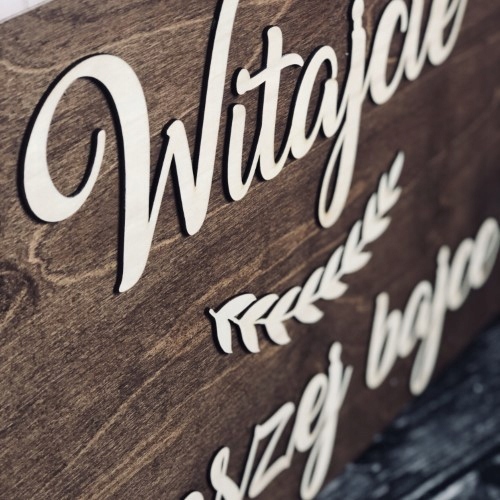 Деревянная свадебная доска цвета темного дерева, изготовленная из фанеры, морилка. Дополнительно имеется надпись «Добро пожаловать в нашу сказку» натурального цвета фанеры.
