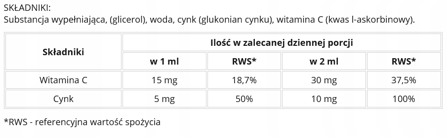 наполняющий вещество (глицеринол), вода, цинк (глюконат цинка), витамин С (L -аскорбиновая кислота).