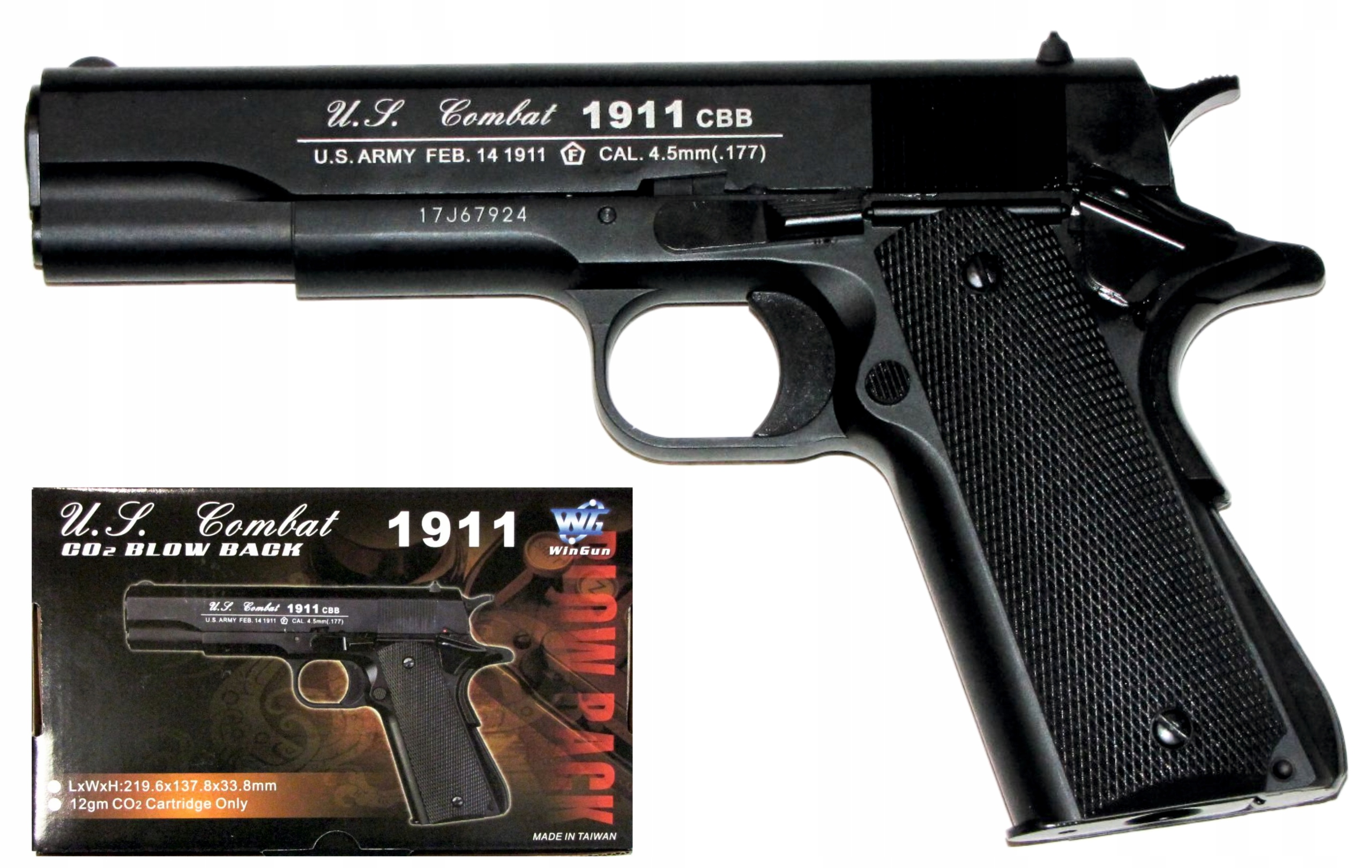 США Combat 1911 CBB - это пистолет с газовым ветром , смоделированный на военной версии Colt 1911 . Он полностью изготовлен из металла, исключением является подкладка ручки перфорированного ABS, которая очень хорошо делает оружие в руке. Он стреляет только с 4,5 -миллиметровыми стальными шариками (ровно 4,46 мм) - боеприпасы свинца не должны использоваться ! Он оснащен картриджем CO2 12G, который позволяет снимать до 60 сильные выстрелы. Пистолет идеально подходит для участия в соревнованиях.